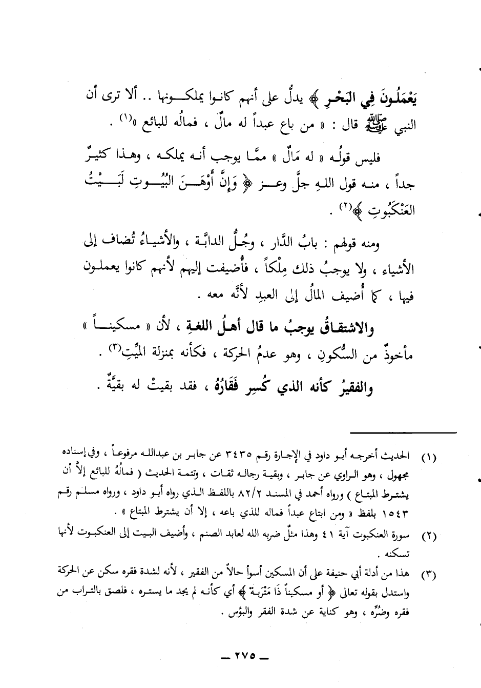 يعملون في البحر يدل على أنهم كانوا يملكونها ألا ترى أن النبي (ص) قال من باع عبدا له مال فماله للبائع فليس قوله له مال مما يوجب أنه يملكه وهذا كثير جدا منه قول الله جل وعز وإن أوهن البيوت لبيت العنكبوت ومنه قولهم باب الدار وجل الدابة والأشياء تضاف الى الأشياء ولا يوجب ذلك ملكا فأضيفت إليهم لأنهم كانوا يعملون فيها كما أضيف المال الى العبد لأنه معه والاشتقاق يوجب ما قال أهل اللغة لأن مسكينا مأخوذ من السكون وهو عدم الحركة فكأنه بمنزلة الميت والفقير كأنه الذي كسر فقاره فقد بقيت له بقية
