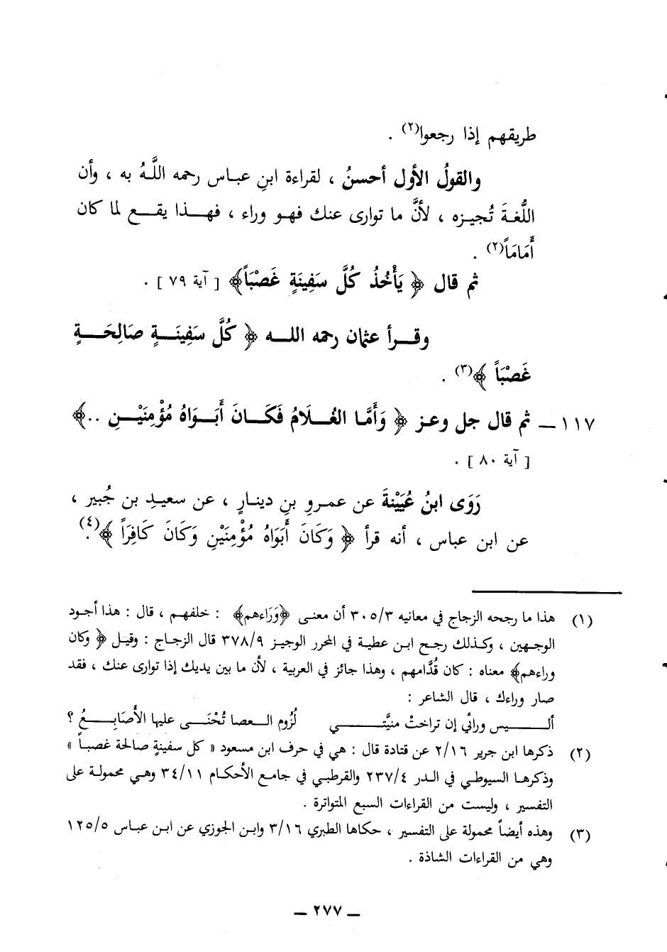 طريقهم إذا رجعوا والقول الأول أحسن لقراءة ابن عباس رحمه الله به وأن اللغة تجيزه لأن ما توارى عنك فهو وراء فهذا يقع لما كان أماما ثم قال يأخذ كل سفينه غصبا وقرأ عثمان رحمه الله كل سفينه صالحة غصبا 117 - ثم قال جل وعز وأما الغلام فكان أبواه مؤمنين روى ابن عيينة عن عمرو بن دينار عن سعيد بن جبير عن ابن عباس أنه قرأ وكان أبواه مؤمنين وكان كافرا