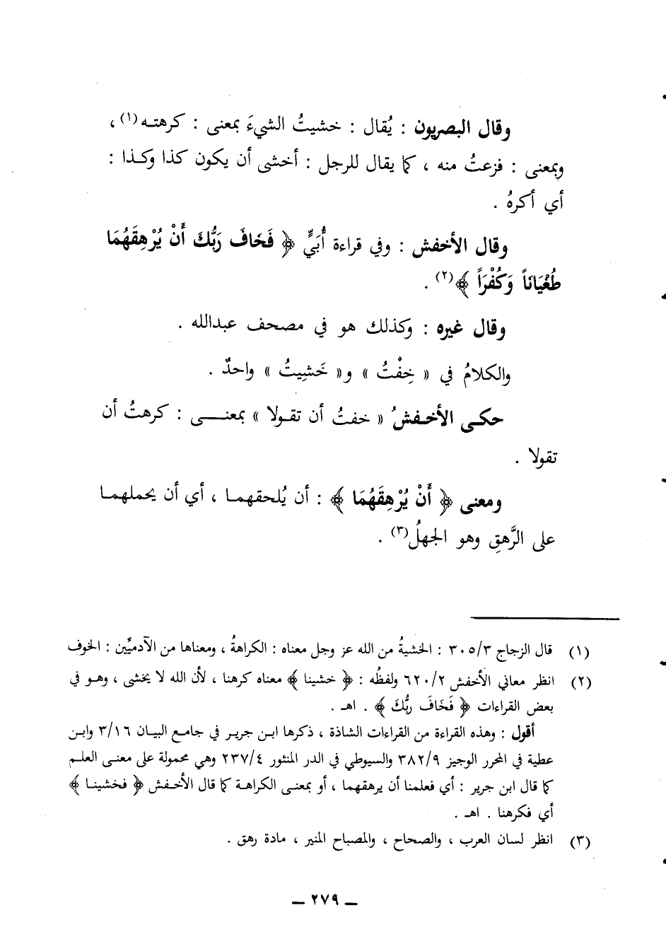 وقال البصريون يقال خشيت الشئ بمعنى كرهته وبمعنى فزعت منه كما يقال للرجل أخشى أن يكون كذا وكذا أي أكره وقال الأخفش وفي قراءة أبي فخاف ربك أن يرهقهما طغيانا وكفرا وقال غيره وكذلك هو في مصحف عبد الله والكلام في خفت وخشيت واحد حكى الأخفش خفت أن تقولا بمعنى كرهت أن تقولا ومعنى أن يرهقهما أن يلحقهما أي أن يحملهما على الرهق وهو الجهل