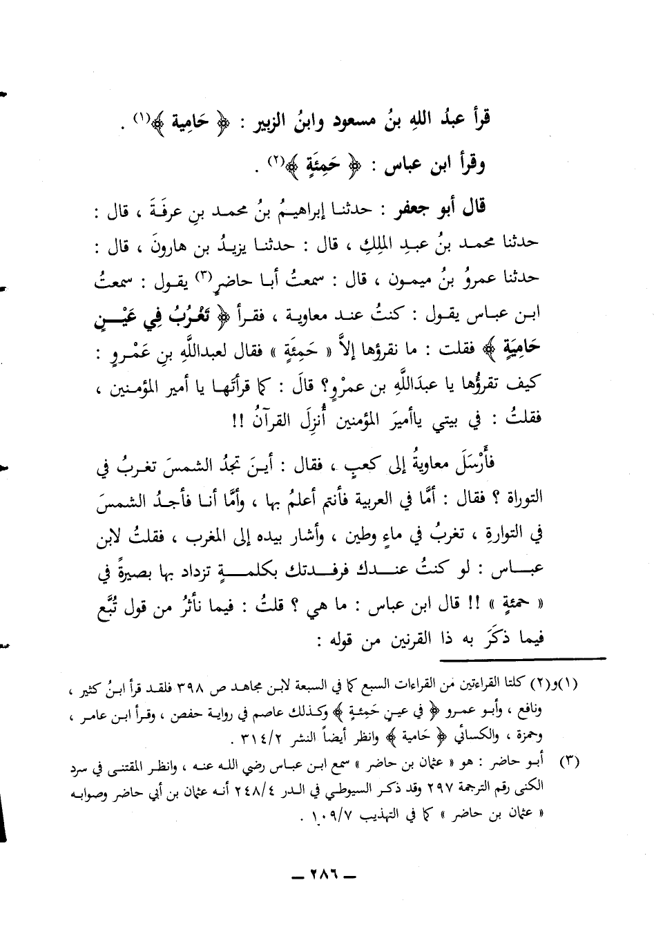 قال أبو جعفر حدثنا إبراهيم بن محمد بن عرفة قال حدثنا محمد بن عبد الملك قال حدثنا يزيد بن هارون قال حدثنا عمرو بن ميمون قال سمعت أبا حاضر يقول سمعت ابن عباس يقول كنت عند معاوية فقرأ تغرب في عين حامية فقلت ما نقرؤها إلا حمئة فقال لعبد الله بن عمرو كيف تقرؤها يا عبد الله بن عمرو قال كما قرأتها يا أمير المؤمنين فقلت في بيتي يا أمير المؤمنين أنزل القرآن فأرسل معاوية الى كعب فقال أين تجد الشمس تغرب في التوراة فقال أما في العربية فأنتم أعلم بها وأما أنا فأجد الشمس في التوراة تغرب في ماء وطين وأشار بيده الى المغرب فقلت لابن عباس لو كنت عندك فرفدتك الرحمن بكلمة تزداد بها بصيرة في حمئة قال ابن عباس ما هي قلت فيما نأثر من قول تبع فيما ذكر به ذا القرنين من قوله