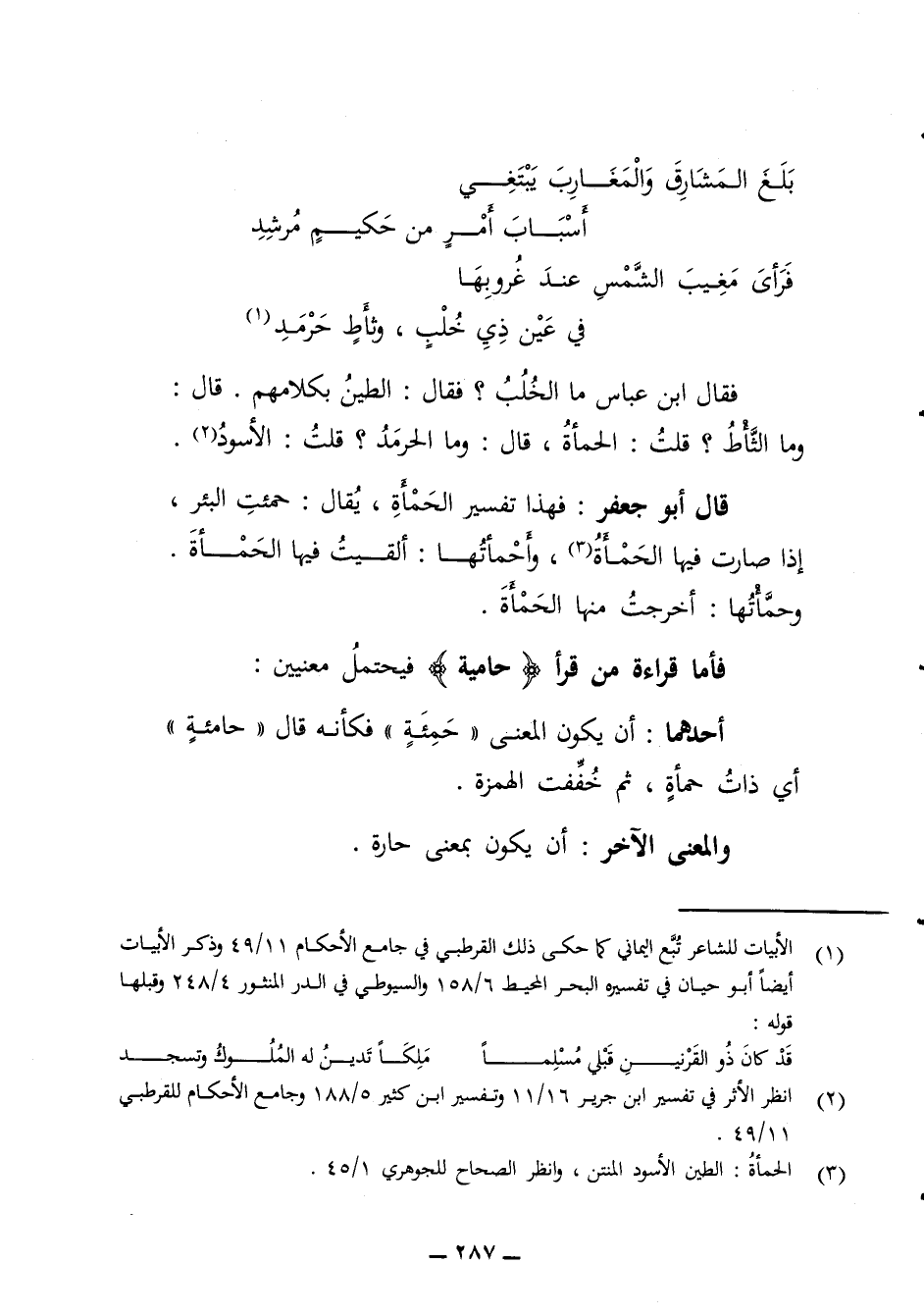 * بلغ المشارق والمغارب يبتغي * أسباب أمر من حكيم مرشد فرأى مغيب الشمس عند غروبها * في عين ذي خلب وثاط حرمد * فقال ابن عباس ما الخلب فقال الطين بكلامهم قال وما الثاط قلت الحمأة قال وما الحرمد قلت الأسود قال أبو جعفر فهذا تفسير الحمأة يقال حمئت البئر إذا صارت فيها الحمأة وأحمأتها ألقيت فيها الحمأة