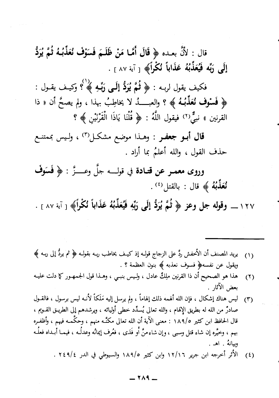 القرنين نبي فيقول الله قلنا يا ذا القرنين قال أبو جعفر وهذا موضع مشكل وليس بممتنع حذف القول والله أعلم بما أراد وروى معمر عن قتادة في قوله جل وعز فسوف نعذبه قال بالقتل 127 - وقوله جل وعز ثم يرد الى ربه فيعذبه عذابا نكرا