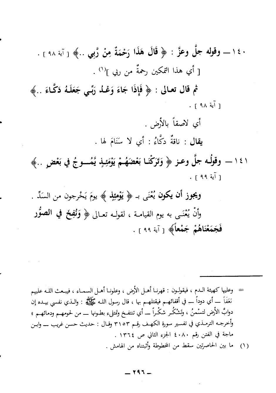 140 - وقوله جل وعز قال هذا رحمة من ربي أي هذا التمكين رحمة من ربي ثم قال تعالى فإذا جاء وعد ربي جعله دكاء أي لاصقا بالأرض يقال ناقة دكاء أي لا سنام لها 141 - وقوله جل وعز وتركنا بعضهم يومئذ يموج في بعض ويجوز أن يكون يعني ب يومئذ يوم يخرجون من السد وأن يعني به يوم القيامة لقوله تعالى ونفخ في الصور فجمعناهم جمعا