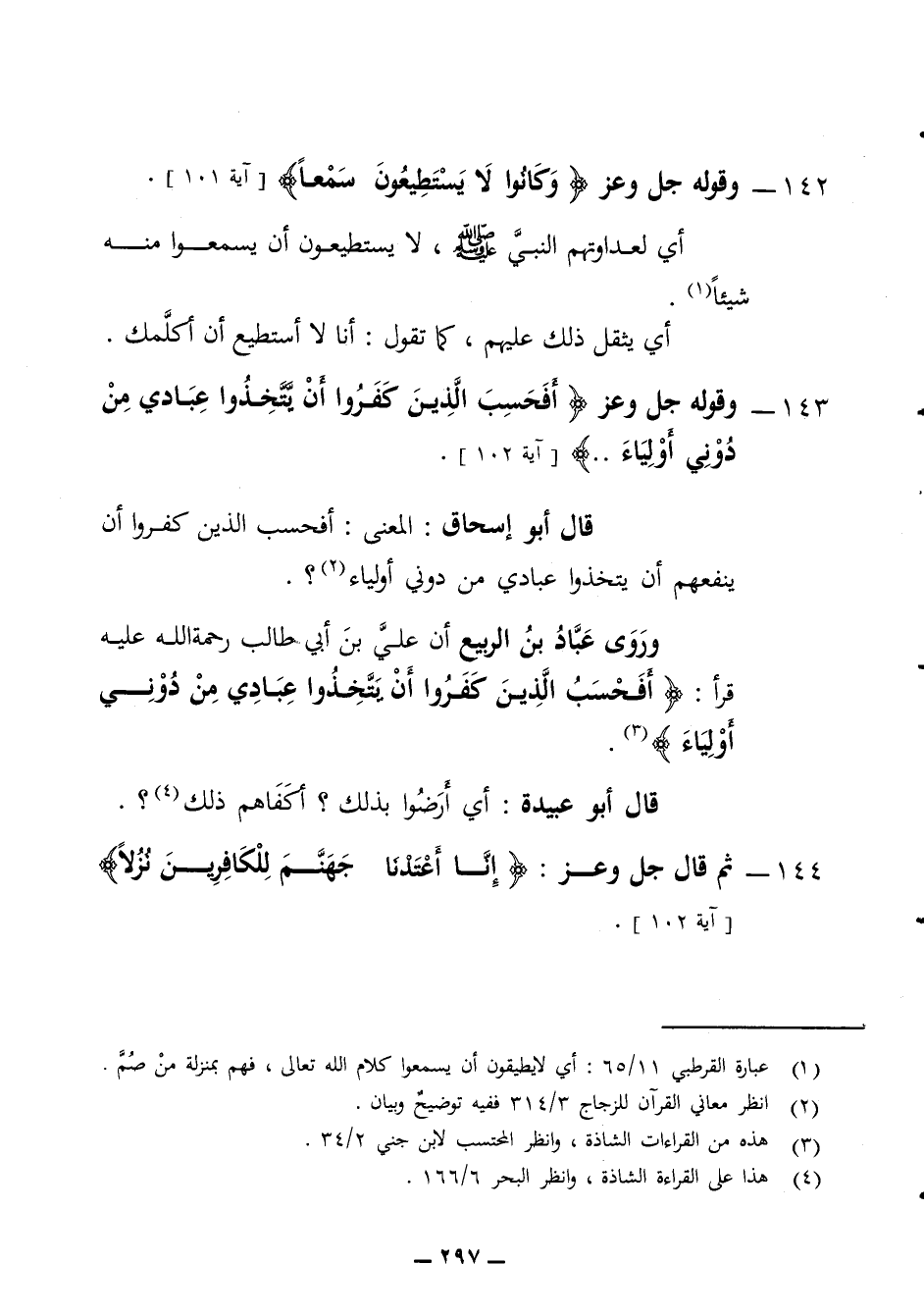 أي لعداوتهم النبي (ص) لا يستطيعون أن يسمعوا منه شيئا أي يثقل ذلك عليهم كما تقول أنا لا أستطيع أن أكلمك 143 - وقوله جل وعز أفحسب الذين كفروا أن يتخذوا عبادي من دوني أولياء قال أبو إسحاق المعنى أفحسب الذين كفروا أن ينفعهم أن يتخذوا عبادي من دوني أولياء وروى عباد بن الربيع أن علي بن أبي طالب رحمة الله عليه قرأ أفحسب الذين كفروا أن يتخذوا عبادي من دوني أولياء قال أبو عبيدة أي أرضوا بذلك أكفاهم ذلك 144 - ثم قال جل وعز إنا أعتدنا جهنم للكافرين نزلا