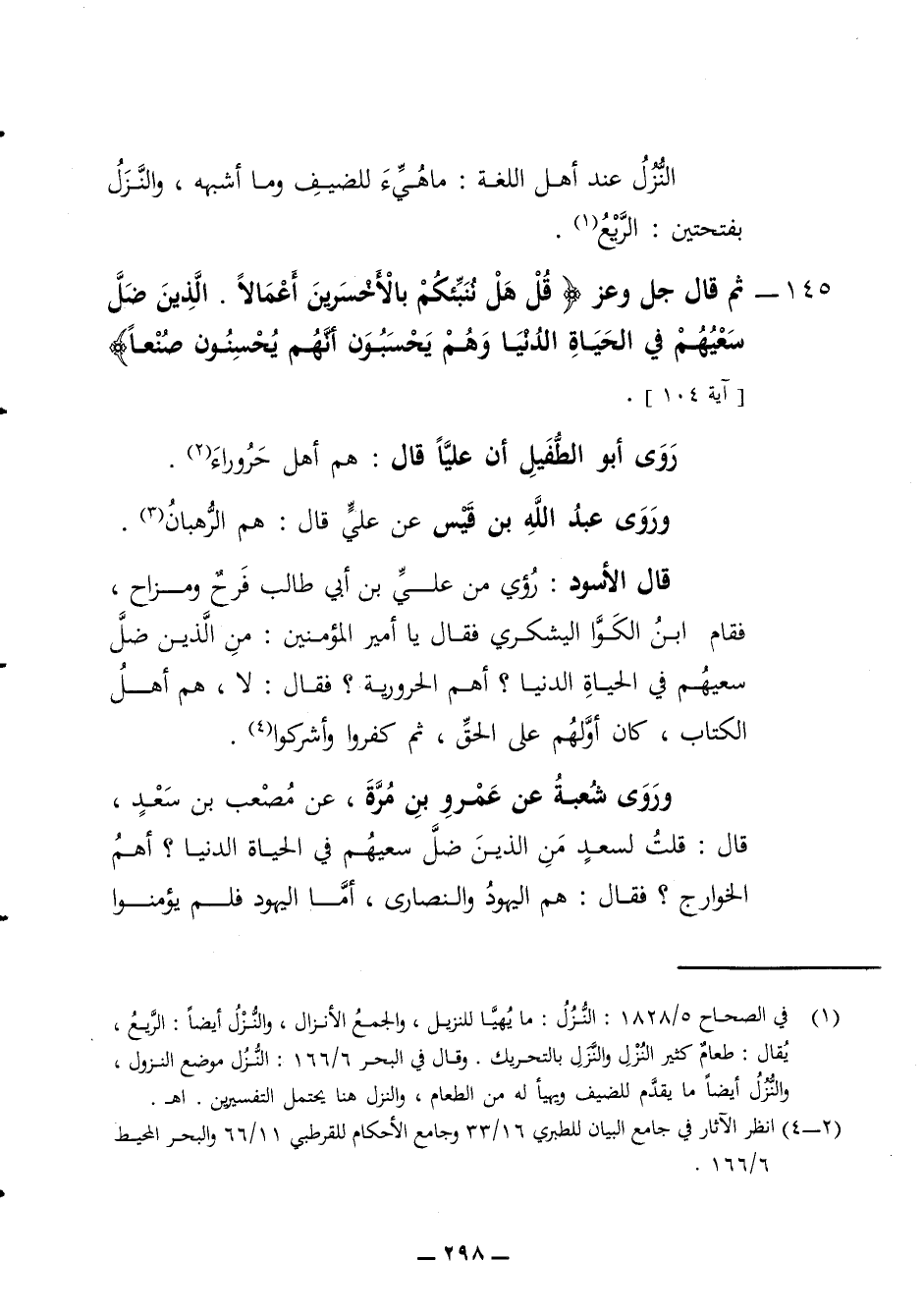 النزل عند أهل اللغة ما هئ للضيف وما أشبهه والنزل بفتحتين الريع 145 - ثم قال جل وعز قل هل ننبئكم بالأخسرين أعمالا الذين ضل سعيهم في الحياة الدنيا وهم يحسبون أنهم يحسنون صنعا روى أبو الطفيل أن عليا قال هم أهل حروراء وروى عبد الله بن قيس عن علي قال هم الرهبان قال الأسود رؤى من علي بن أبي طالب فرح ومزاح فقام ابن الكوا اليشكري فقال يا أمير المؤمنين من الذين ضل سعيهم في الحياة الدنيا أهم الحرورية فقال لا هم أهل الكتاب كان أولهم على الحق ثم كفروا وأشركوا وروى شعبة عن عمرو بن مرة عن مصعب بن سعد