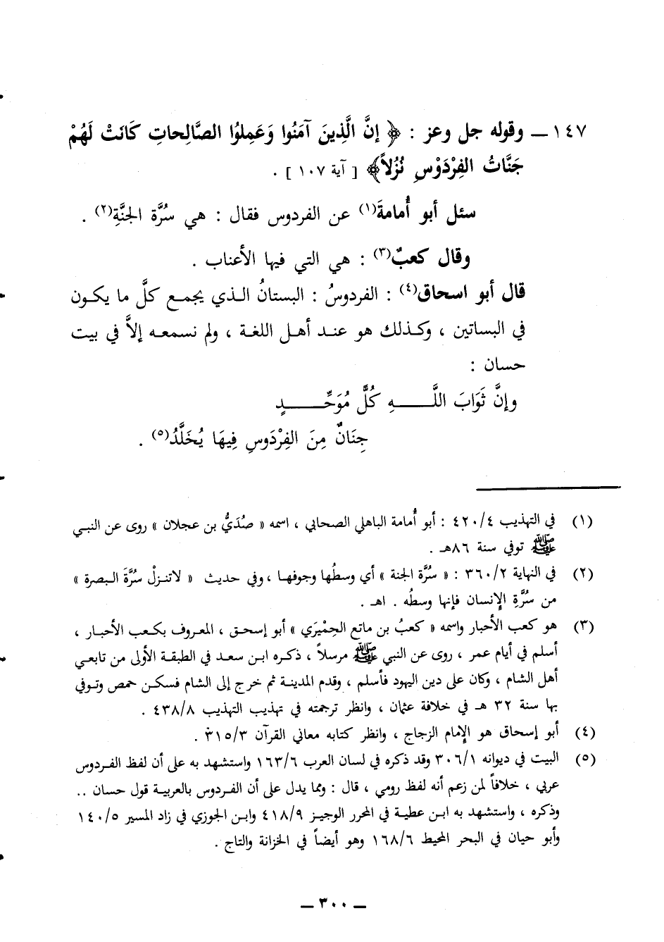 147 - وقوله جل وعز إن الذين آمنوا وعملوا الصالحات كانت لهم جنات الفردوس نزلا سئل أبو أمامة عن الفردوس فقال هي سرة الجنة وقال كعب هي التي فيها الأعناب قال أبو اسحاق الفردوس البستان الذي يجمع كل ما يكون في البساتين وكذلك هو عند أهل اللغة ولم نسمعه إلا في بيت حسان * وإن ثواب الله كل موحد * جنان من الفردوس فيها يخلد *