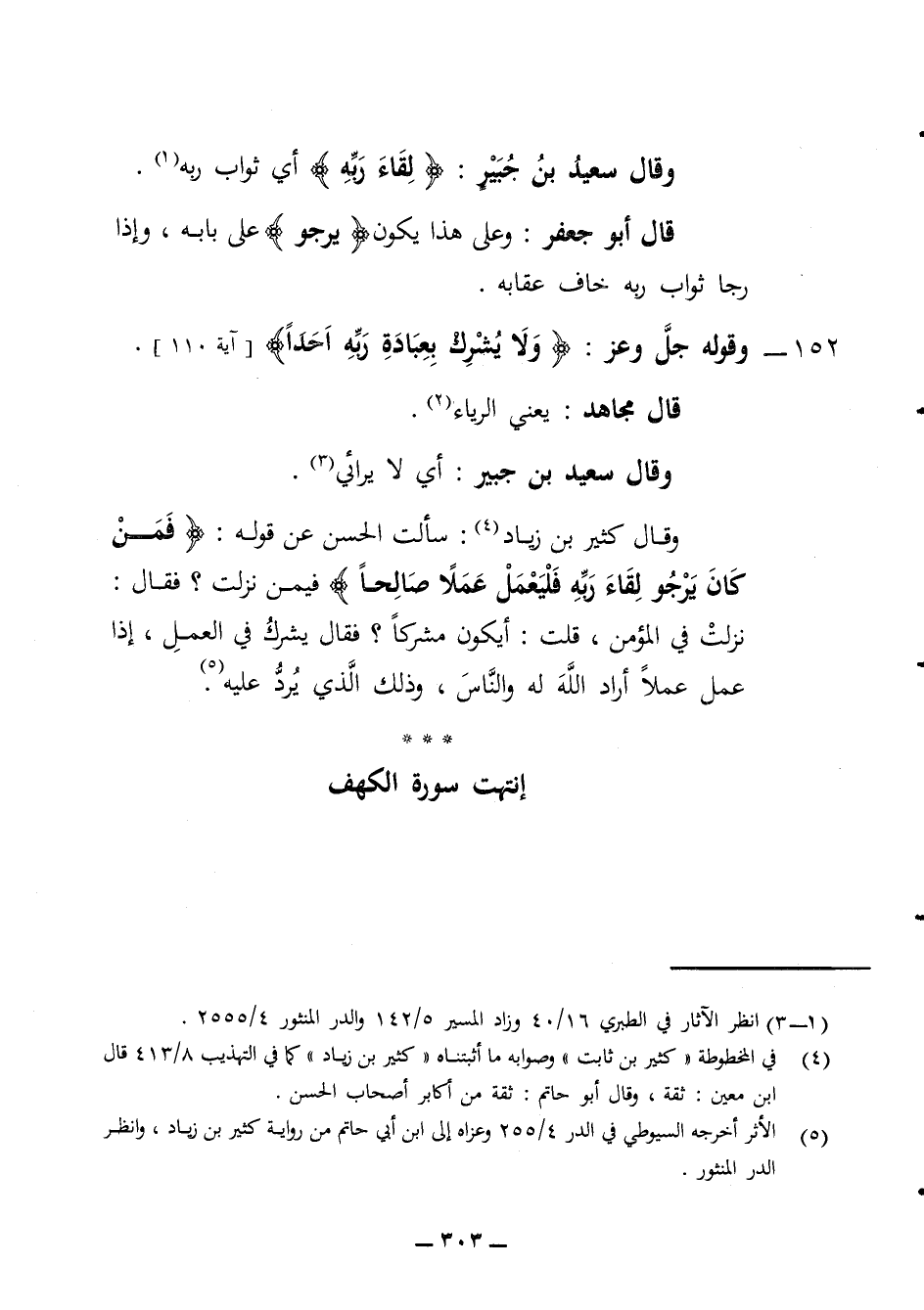 وقال سعيد بن جبير لقاء ربه أي ثواب ربه قال أبو جعفر وعلى هذا يكون يرجو على بابه وإذا رجا ثواب ربه خاف عقابه 152 - وقوله جل وعز ولا يشرك بعبادة ربه احدا قال مجاهد يعني الرياء وقال سعيد بن جبير أي لا يرائي وقال كثير بن زياد سألت الحسن عن قوله فمن كان يرجو لقاء ربه فليعمل عملا صالحا فيمن نزلت فقال نزلت في المؤمن قلت أيكون مشركا فقال يشرك في العمل إذا عمل عملا أراد الله له والناس وذلك الذي يرد عليه إنتهت سورة الكهف