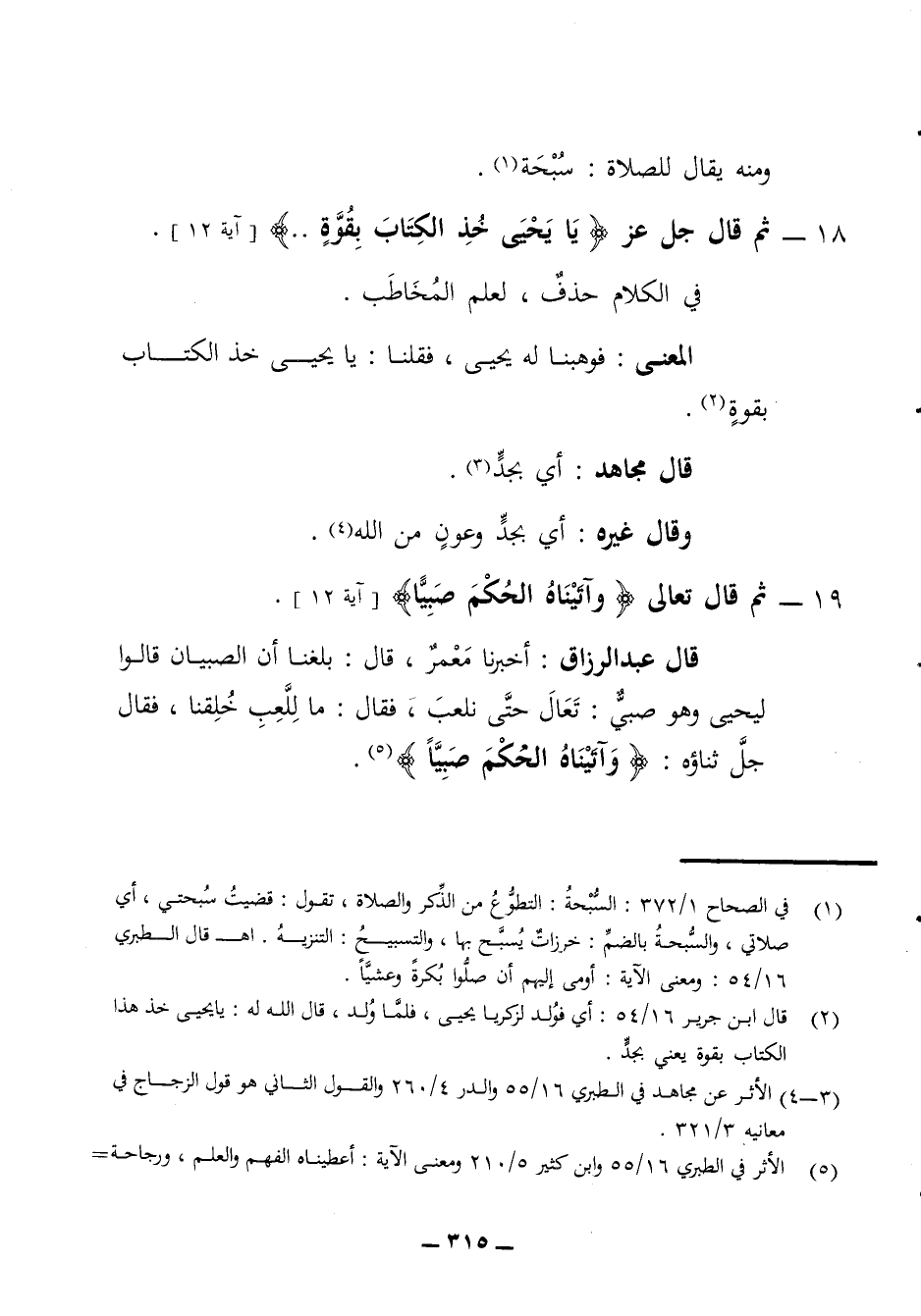 ومنه يقال للصلاة سبحة 18 - ثم قال جل وعز يا يحيى خذ الكتاب بقوة في الكلام حذف لعلم المخاطب المعنى فوهبنا له يحيى فقلنا يا يحيى خذ الكتاب بقوه قال مجاهد أي بجد وقال غيره أي بجد وعون من الله