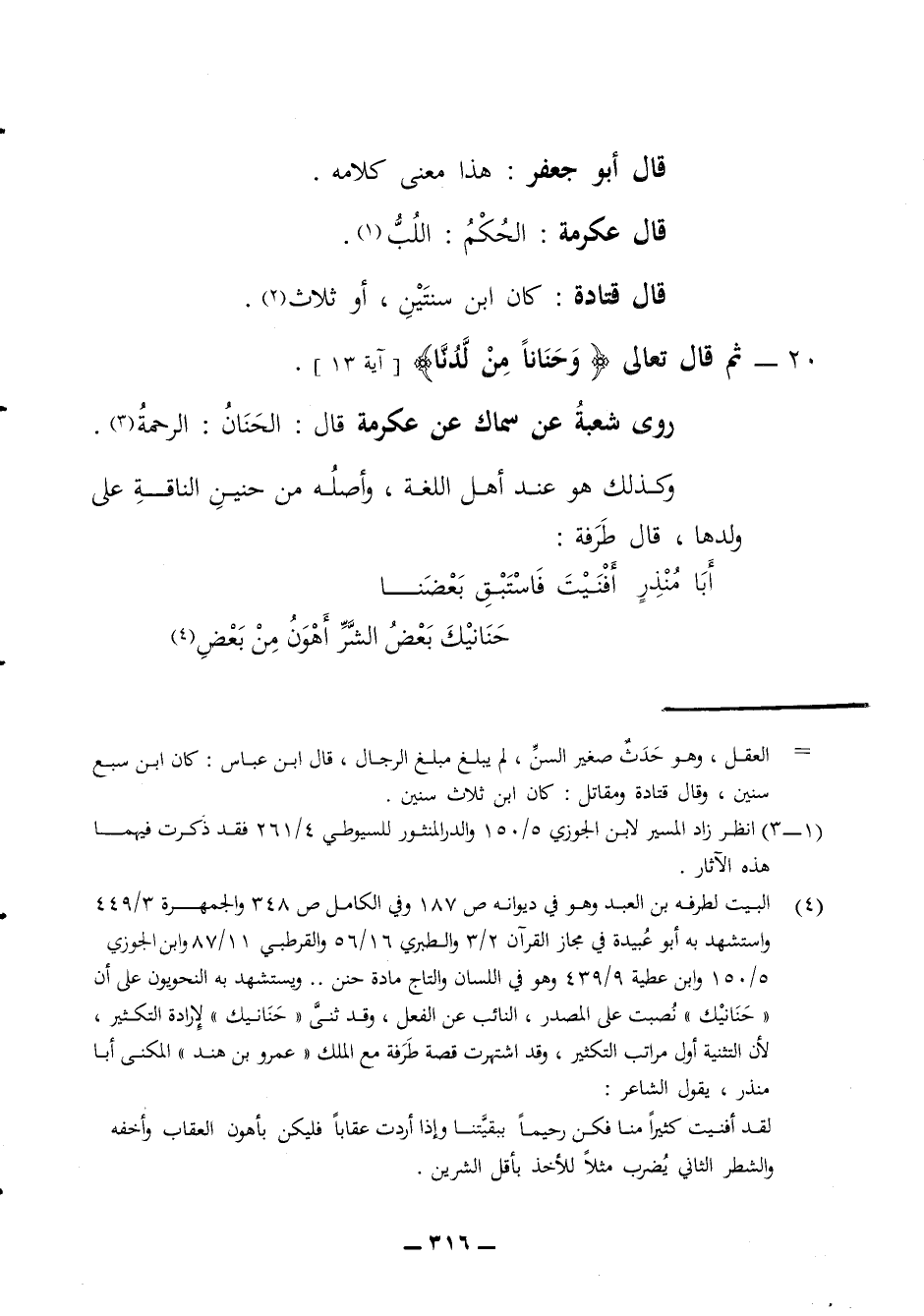 قال أبو جعفر هذا معنى كلامه قال عكرمة الحكم اللب قال قتادة كان ابن سنتين أو ثلاث 20 - ثم قال تعالى وحنانا من لدنا روى شعبة عن سماك عن عكرمة قال الحنان الرحمة وكذلك هو عند أهل اللغة وأصله من حنين الناقة على ولدها قال طرفة * أبا منذر أفنيت فاستبق بعضنا * حنانيك بعض الشر أهون من بعض *
