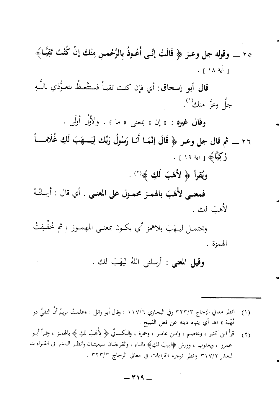 25 - وقوله جل وعز قالت إني أعوذ بالرحمن منك إن كنت تقيا قال أبو اسحاق أي فإن كنت تقيا فستتعظ بين بتعوذي بالله جل وعز منك وقال غيره إن بمعنى ما والأول أولى 26 - ثم قال جل وعز قال إنما أنا رسول ربك ليهب لك غلاما