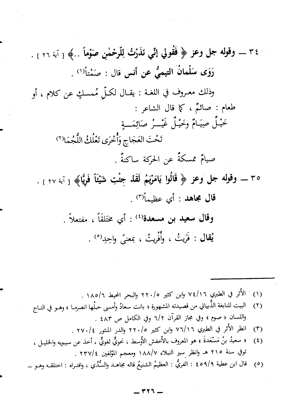 34 - وقوله جل وعز فقولي إني نذرت للرحمن صوما روى سلمان التيمي عن أنس قال صمتا وذلك معروف في اللغة يقال لكل ممسك عن كلام أو طعام صائم كما قال الشاعر * خيل صيام وخيل غير صائمة * تحت العجاج وأخرى تعلك اللجما * صيام ممسكة عن الحركة ساكنة 35 - وقوله جل وعز قالوا يا مريم لقد جئت شيئا فريا