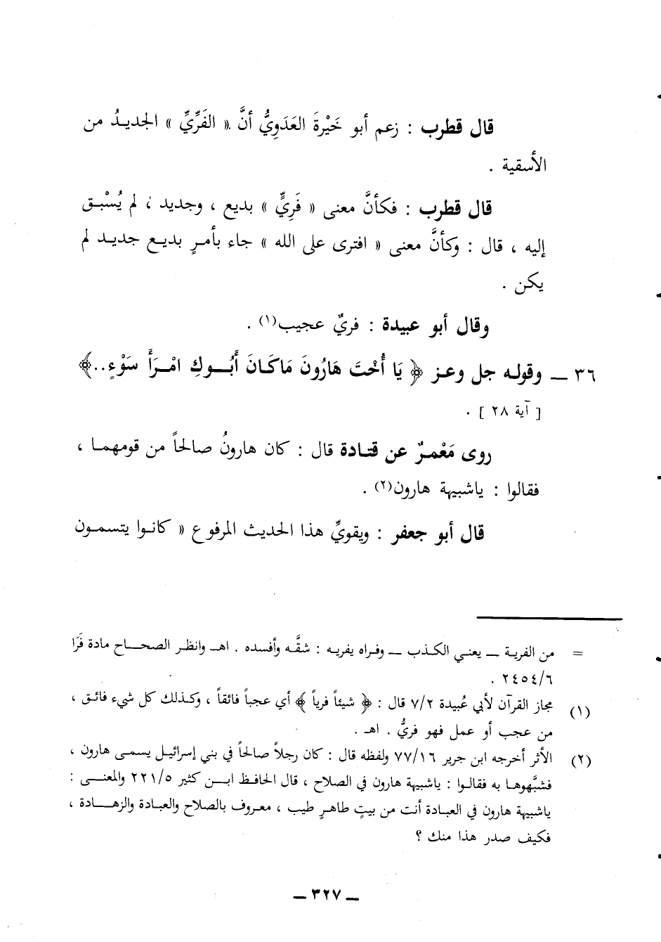 قال قطرب زعم أبو خيرة العدوى أن الفري الجديد من الأسقية قال قطرب فكأن معنى فري بديع وجديد لم يسبق إليه قال وكان معنى افترى على الله جاء بأمر بديع جديد لم يكن وقال أبو عبيدة فري عجيب 36 - وقوله جل وعز يا أخت هارون ما كان أبوك امرأ سوء روى معمر عن قتادة قال كان هارون صالحا من قومهما فقالوا يا شبيهه هارون قال أبو جعفر ويقوي هذا الحديث المرفوع كانوا يتسمون