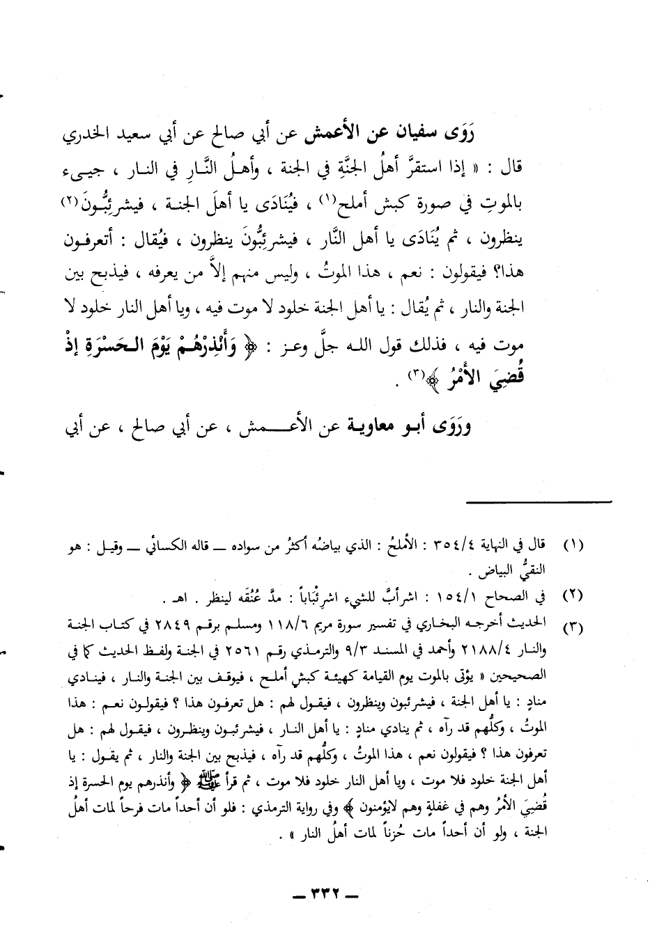 روى سفيان عن الأعمش عن أبي صالح عن أبي سعيد الخدري قال إذا استقر أهل الجنة في الجنة وأهل النار في النار جيئ بالموت في صورة كبش أملح فينادي يا أهل الجنة فيشرئبون ينظرون ثم ينادي يا أهل النار فيشرئبون ينظرون فيقال أتعرفون هذا فيقولون نعم هذا الموت وليس منهم إلا من يعرفه فيذبح بين الجنة والنار ثم يقال يا أهل الجنة خلود لا موت فيه ويا أهل النار خلود لا موت فيه فذلك قول الله جل وعز وأنذرهم يوم الحسرة إذ قضي الأمر وروى أبو معاوية عن الأعمش عن أبي صالح عن أبي