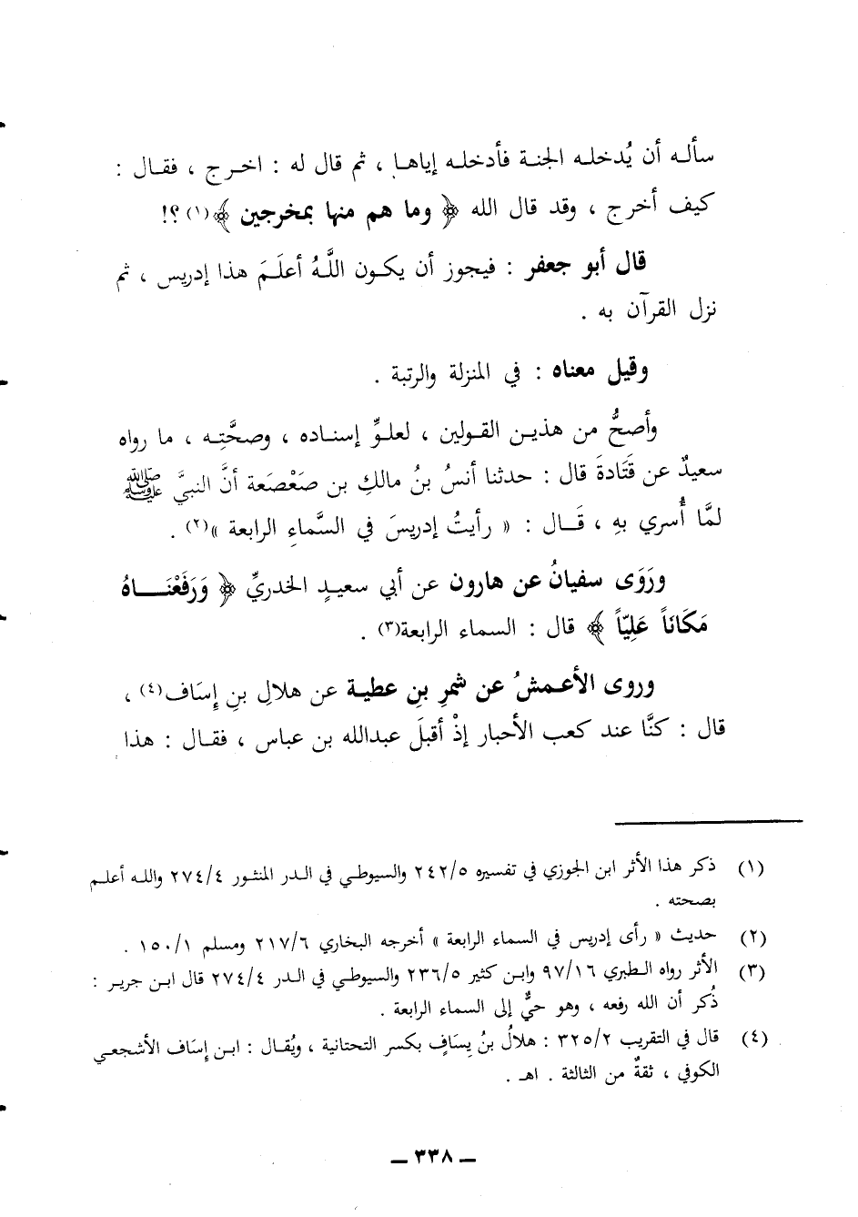 سأله أن يدخله الجنة فأدخله إياها ثم قال له اخرج فقال كيف أخرج وقد قال الله وما هم منها بمخرجين قال أبو جعفر فيجوز أن يكون الله أعلم هذا إدريس ثم نزل القرآن به وقيل معناه في المنزلة والرتية وأصح من هذين القولين لعلو إسنادة وصحته ما رواه سعيد عن قتادة قال حدثنا أنس بن مالك بن صعصعة ان النبي (صلى) لما أسرى به قال رأيت إدريس في السماء الرابعة وروى سفيان عن هارون عن ابي سعيد الخدري ورفعناه مكانا عليا قال السماء الرابعة وروى الأعمش عن شمر بن عطية عن هلال بن إساف