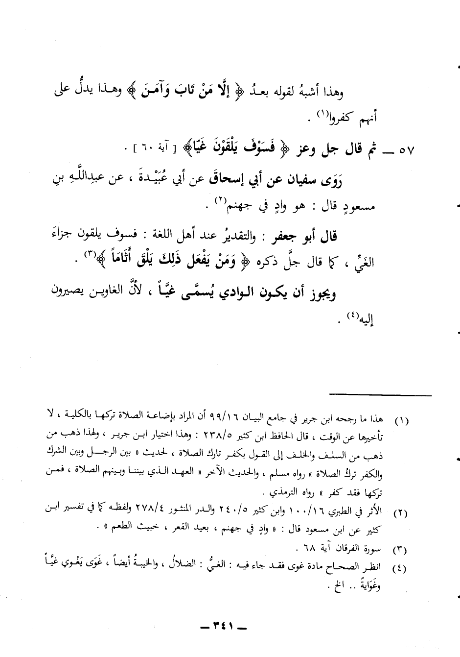 وهذا أشبه لقوله بعد إلا من تاب وآمن وهذا يدل على أنهم كفروا 57 - ثم قال جل وعز فسوف يلقون غيا روى سفيان عن أبي إسحاق عن أبي عبيدة عن عبد الله بن مسعود قال هو واد في جهنم قال أبو جعفر والتقدير عند أهل اللغة فسوف يلقون جزاء الغي كما قال جل ذكره ومن يفعل ذلك يلق أثاما ويجوز أن يكون الوادي يسمى غيا لأن الغاوين يصيرون إليه