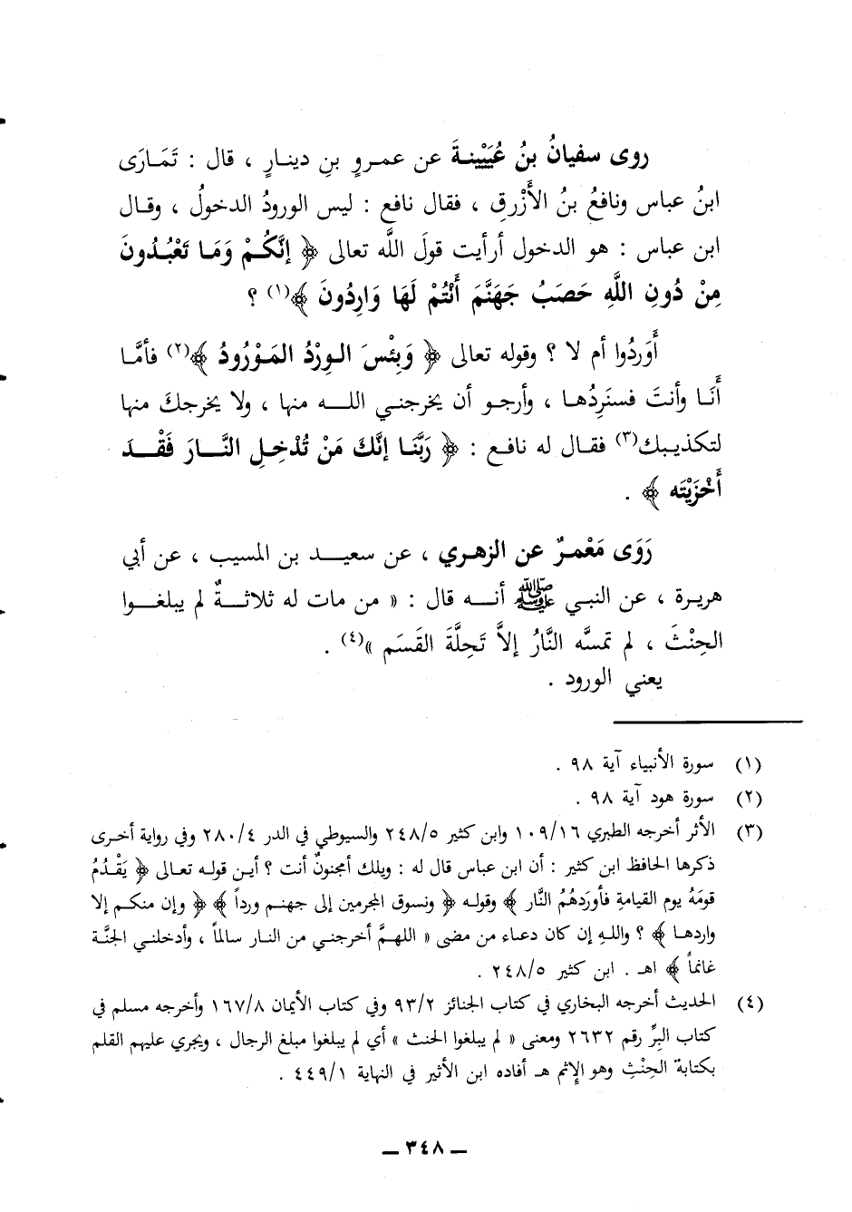 روى سفيان بن عيينة عن عمرو بن دينار قال تمارى ابن عباس ونافع الأزرق فقال نافع ليس الورود الدخول وقال ابن عباس هو الدخول أرأيت قول الله تعالى إنكم وما تعبدون من دون الله تعالى جهنم أنتم لها واردون أوردوا أم لا وقوله تعالى وبئس الورد المورود فأما أنا وأنت فسنردها وأرجو أن يخرجني الله منها ولا يخرجك منها لتكذيبك فقال له نافع ربنا انك يا من تدخل النار فقد أخزيته روى معمر عن الزهري عن سعيد بن المسيب عن أبي هريرة عن النبي صلى الله عليه وسلم أنه قال من مات له ثلاثة لم يبلغوا الحنث لم تمسه النار إلا تحلة القسم يعني الورود