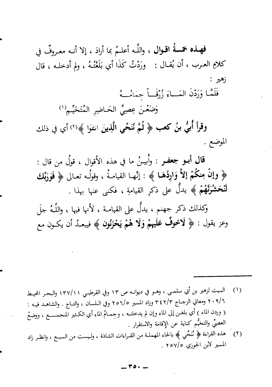 فهذه خمسة أقوال والله أعلم بما أراد إلا أنه معروف في كلام العرب أن يقال وردت كذا أي بلغته ولم أدخله قال زهير * فلما وردن الماء زرقا جمامة * وضعن عصي الحاضر المتخيم * وقرأ أبي بن كعب ثم ننجي الذين اتقوا أي في ذلك الموضع قال أبو جعفر وأبين ما في هذه الأقوال قول من قال وإن منكم إلا واردها إنها القيامة وقوله تعالى فوربك لنحشرنهم يدل على ذكر القيامة فكنى عنها بهذا وكذلك ذكر جهنم يدل على القيامة لأنها فيها والله جل وعز يقول لا خوف عليهم ولا هم يحزنزن فيبعد أن يكون مع