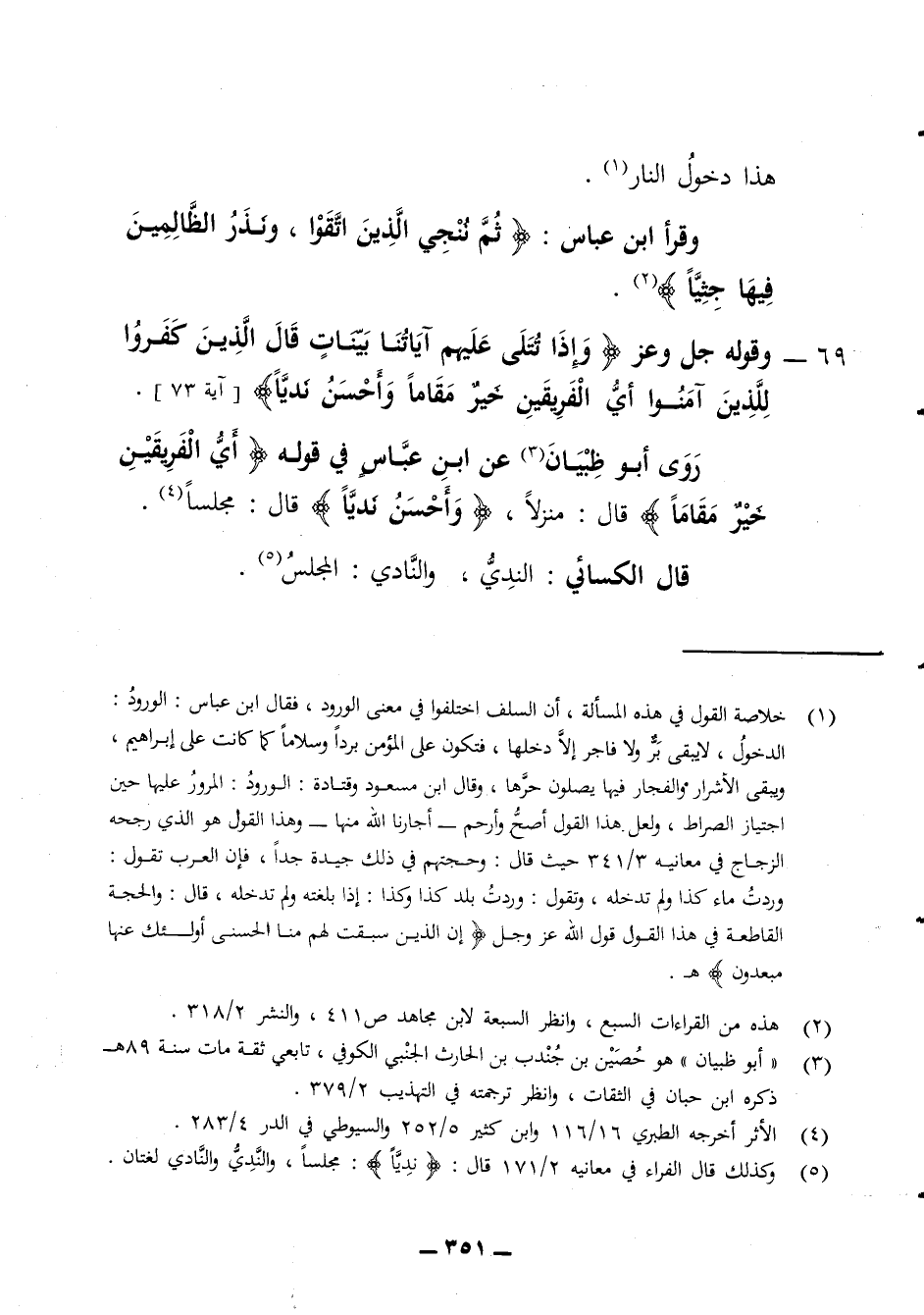 وقرأ ابن عباس ثم ننجي الذين اتقوا ونذر الظالمين فيها جثيا 69 - وقوله جل وعز وإذا تتلى عليهم آياتنا بينات قال الذين كفروا للذين آمنوا أي الفريقين خير مقاما وأحسن نديا روى أبو ظبيان عن ابن عباس في قوله أي الفريقين خير مقاما قال منزلا وأحسن نديا قال مجلسا قال الكسائي الندي والنادي المجلس