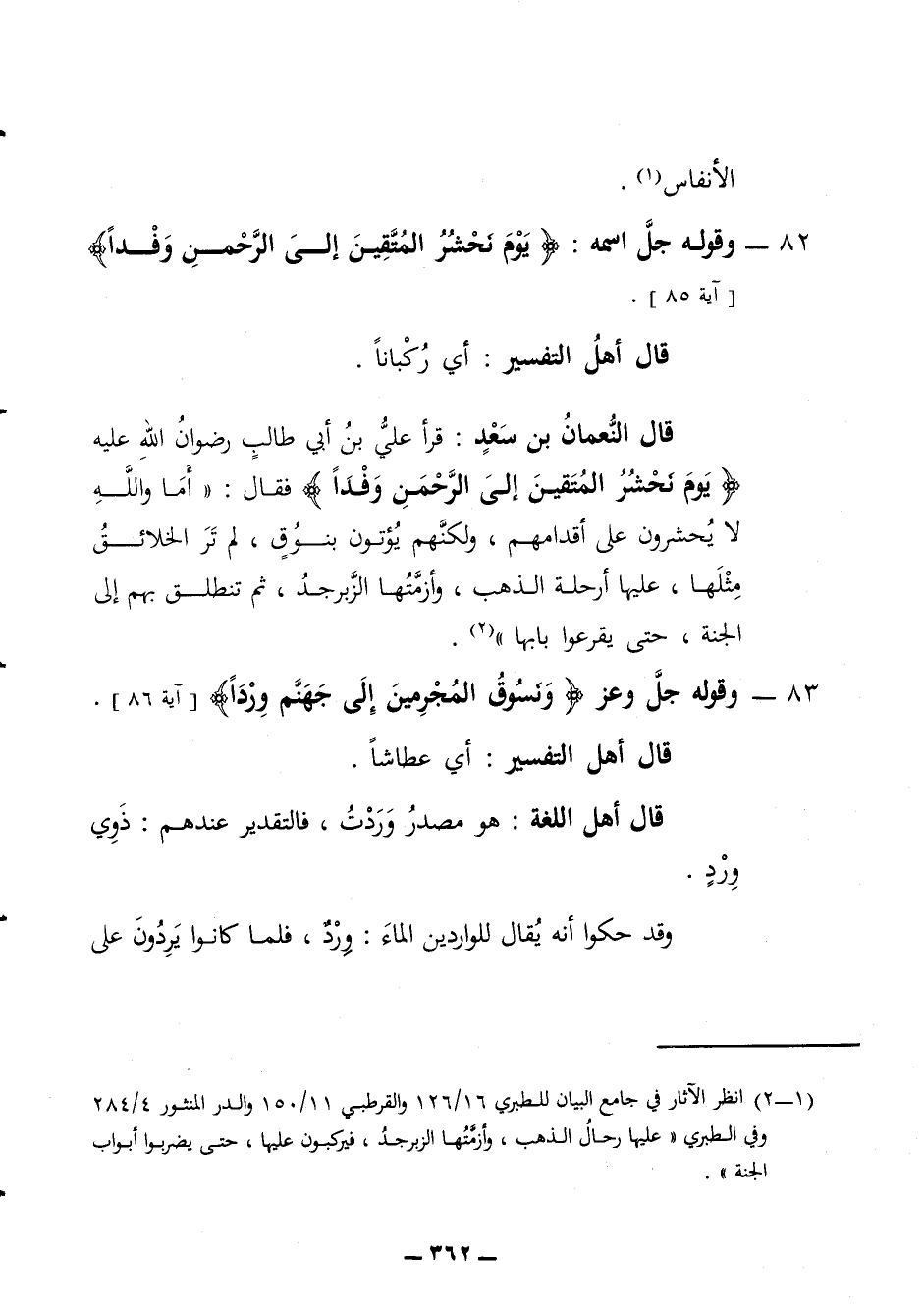 82 - وقوله جل اسمه يوم نحشر المتقين إلى الرحمن وفدا قال أهل التفسير أي ركبانا قال النعمان بن سعد قرأ علي بن أبي طالب رضوان الله عليه يوم نحشر المتقين إلى الرحمن وفدا فقال أما والله لا يحشرون على أقدامهم ولكنهم يؤتون بنوق لم تر الخلائق مثلها عليه أرحلة الذهب وأزمتها الزبرجد ثم تنطلق بهم إلى الجنة حتى يقرعوا بابها 83 - وقوله جل وعز ونسوق المجرمين إلى جهنم وردا قال أهل التفسير أي عطاشا قال أهل اللغة هو مصدر وردت فالتقدير عندهم ذوي ورد وقد حكوا أنه يقال للواردين الماء ورد فلما كانوا يردون على