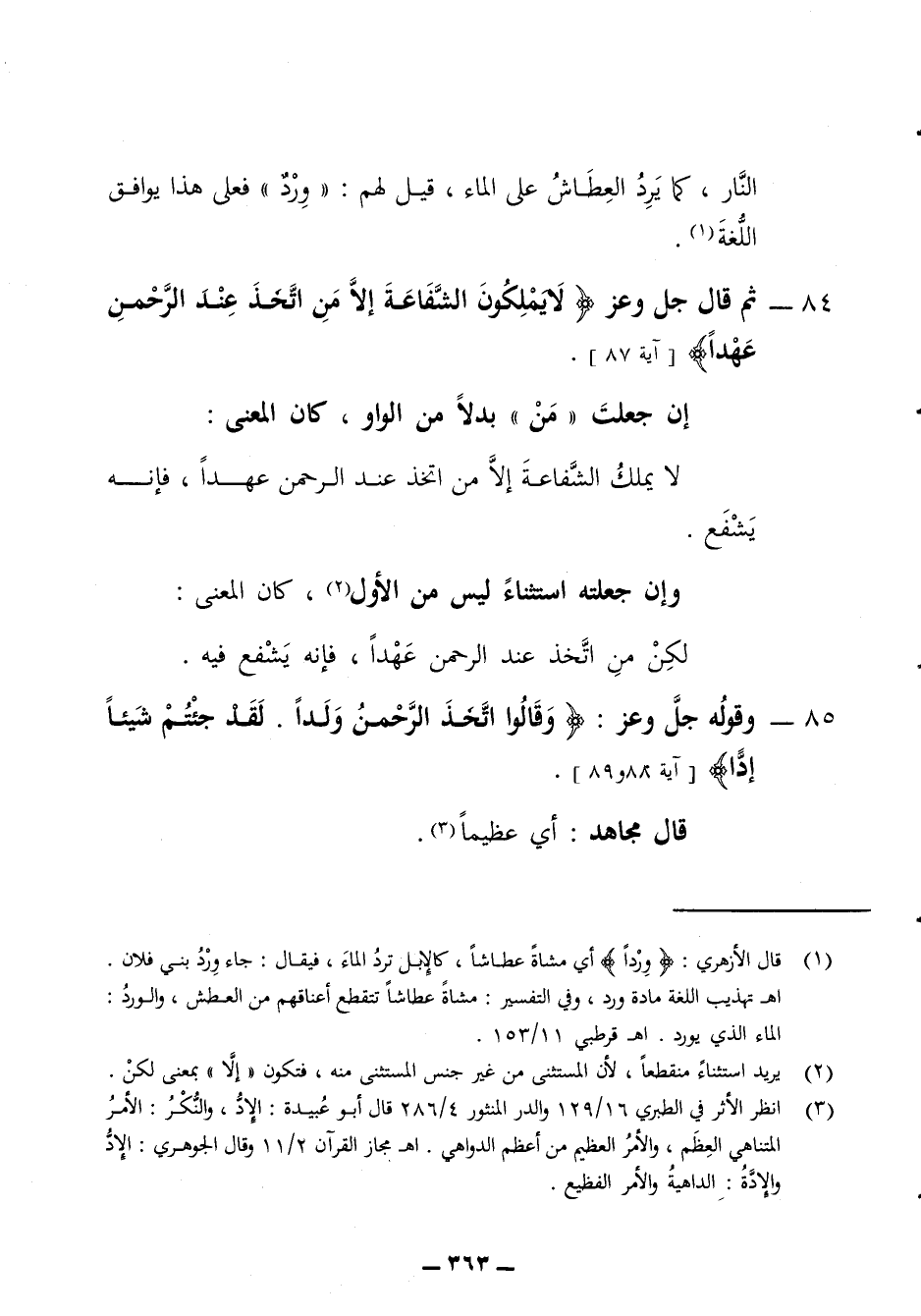 النار كما يرد العطاش على الماء قيل لهم ورد فعلى هذا يوافق اللغة 84 - ثم قال جل وعز لا يملكون الشفاعة إلا من اتخذ عند الرحمن عهدا أن جعلت من بدلا من الواو كان المعنى لا يملك الشفاعة إلا من اتخذ عند الرحمن عهدا فإنه يشفع وإن جعلته استثناء ليس من الأول كان المعنى لكن من اتخذ عند الرحمن عهدا فإنه يشفع فيه