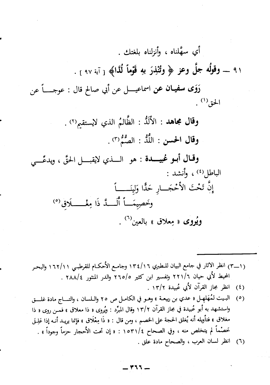 91 - وقوله جل وعز وتنذر به قوما لدا روى سفيان عن اسماعيل عن أبي صالح قال عوجا عن الحق وقال مجاهد الألد الظالم الذي لا يستقيم وقال الحسن اللد الصم وقال أبو عبيدة هو الذي لا يقبل الحق ويدعي الباطل وأنشد * إن تحت الأحجار حدا ولينا * وخصيما ألد ذا مغلاق * ويروى معلاق بالعين