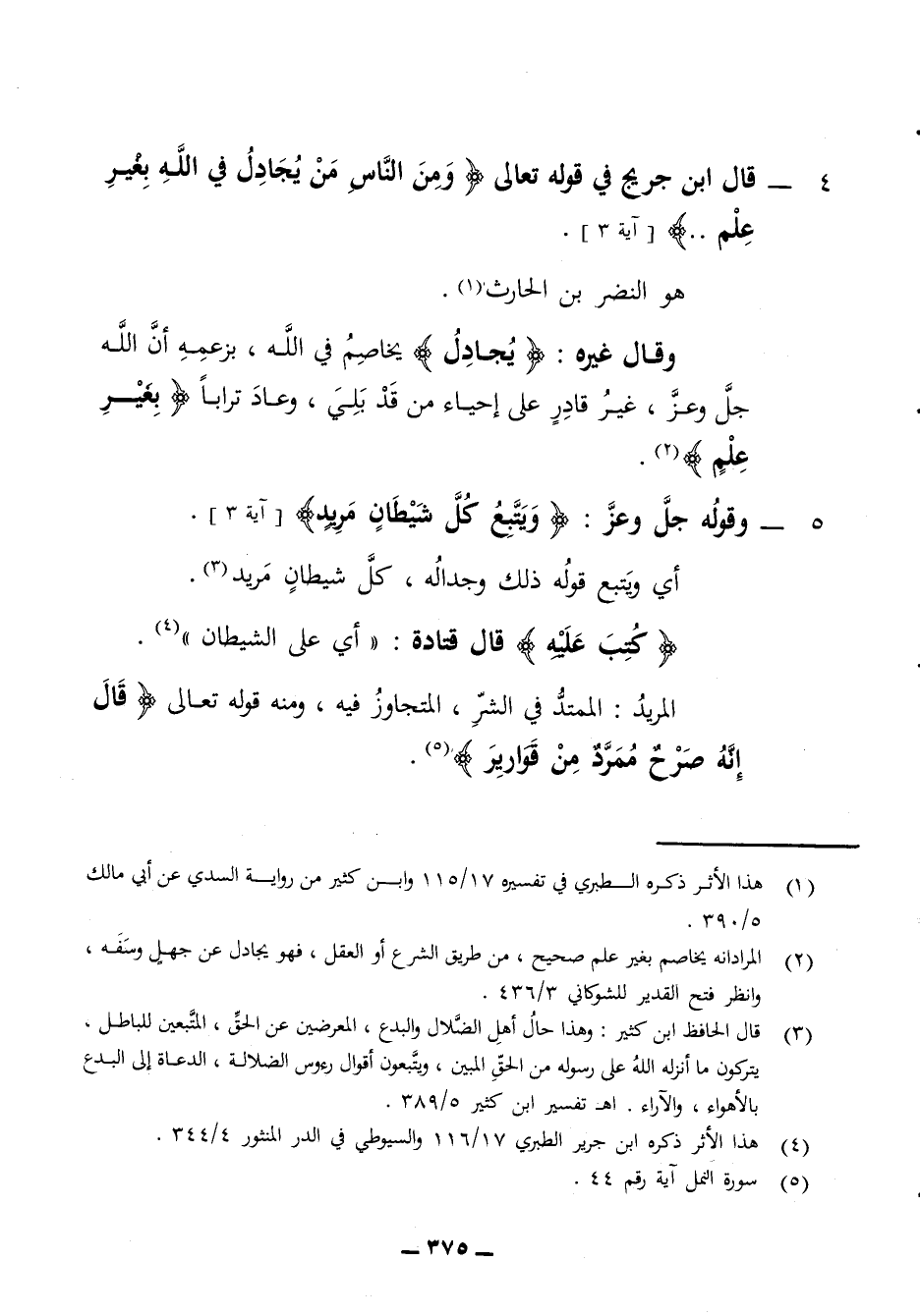 4 - قال ابن جريج في قوله تعالى ومن الناس من يجادل في الله بغير علم هو النضر بن الحارث وقال غيره يجادل يخاصم في الله بزعمه أن الله تعالى جل وعز غير قادر على إحياء من قد بلي وعاد ترابا بغير علم