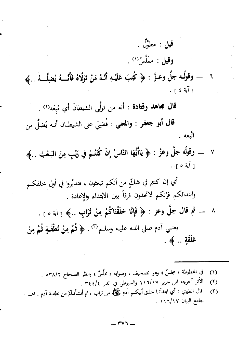 قيل مطول وقيل مملس 6 - وقوله عز وجل كتب عليه أنه من تولاه فأنه يضله ايه قال مجاهد وقتادة أنه من تولى الشيطان أي تبعه قال أبو جعفر والمعنى قضي على الشيطان أنه يضل من أتبعه 7 - وقوله عز وجل يا أيها الناس إن كنتم في ريب من البعث ايه أي ان كنتم في شك من أنكم تبعثون فتدبروا في أول خلقكم وابتدائكم فإنكم لا تجدون فرقا بين الإبتداء والإعادة 8 - ثم قال عز وجل فإنا خلقناكم من تراب ايه يعني ادم صلى الله عليه وسلم ثم من نطفة ثم من علقة