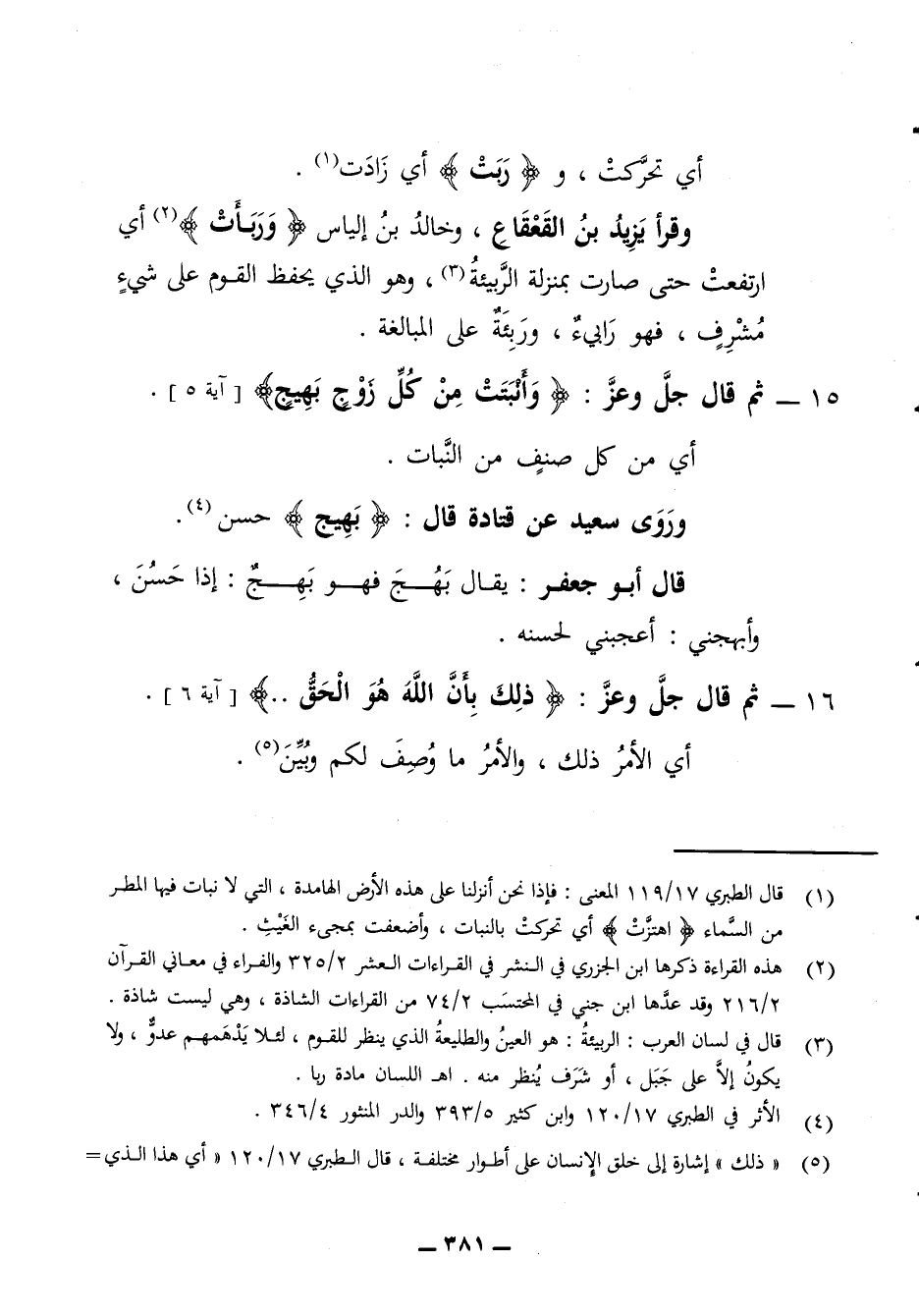 أي تحركت وربت أي زادت وقرأ يزيد بن القعقاع وخالد بن إلياس وربأت أي ارتفعت حتى صارت بمنزلة الربيئة وهو الذي يحفظ القوم على شئ مشرف فهو رابئ * وربئة فلا على المبالغة 15 - ثم قال عز وجل وأنبتت من كل زوج بهيج ايه 5 أي من كل صنف من النبات وروى سعيد عن قتادة قال بهيج حسن قال أبو جعفر يقال بهج فهو بهج إذا حسن وأبهجني أعجبني لحسنه 16 - ثم قال جل وعز ذلك بأن الله هو الحق ايه 6 أي الأمر ذلك والأمر ما وصف لكم وبين