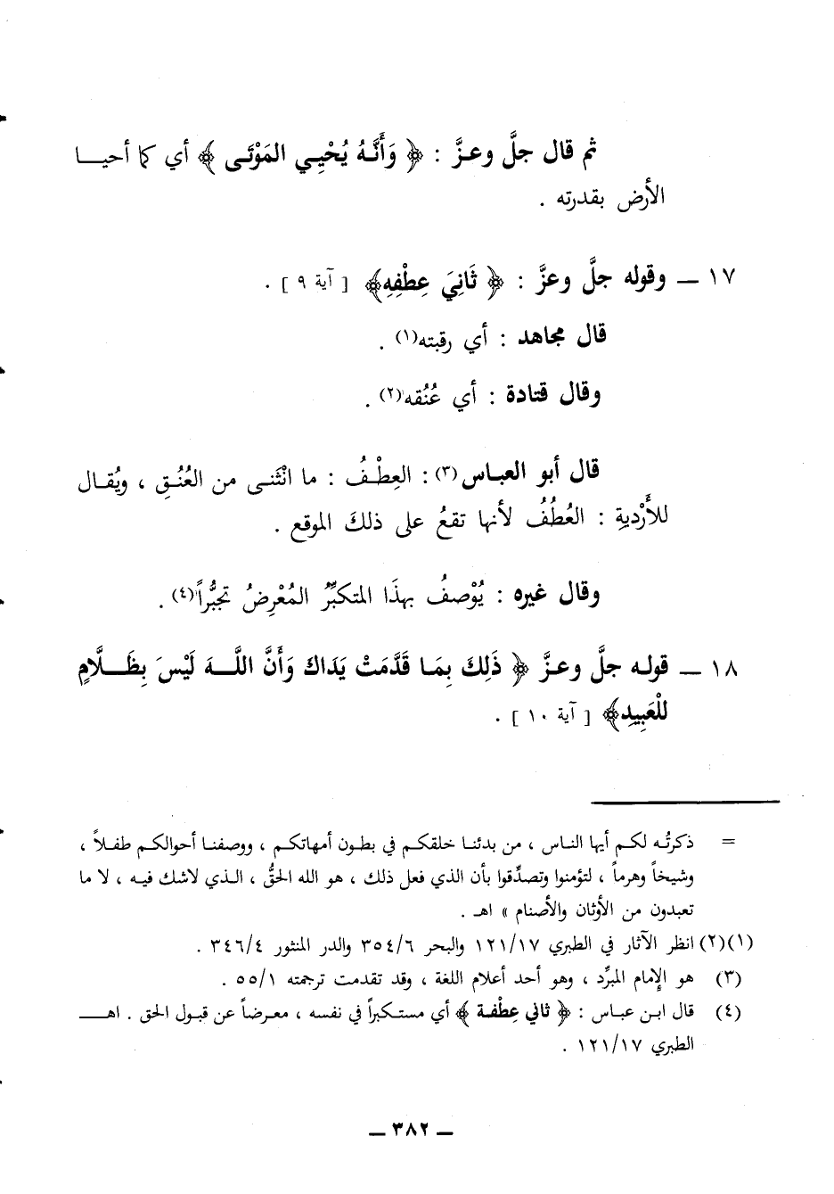 ثم قال جل وعز وأنه يحيي الموتى أي كما أحيا الأرض بقدرته 17 - وقوله جل وعز ثاني عطفه ايه 9 قال مجاهد أي رقبته