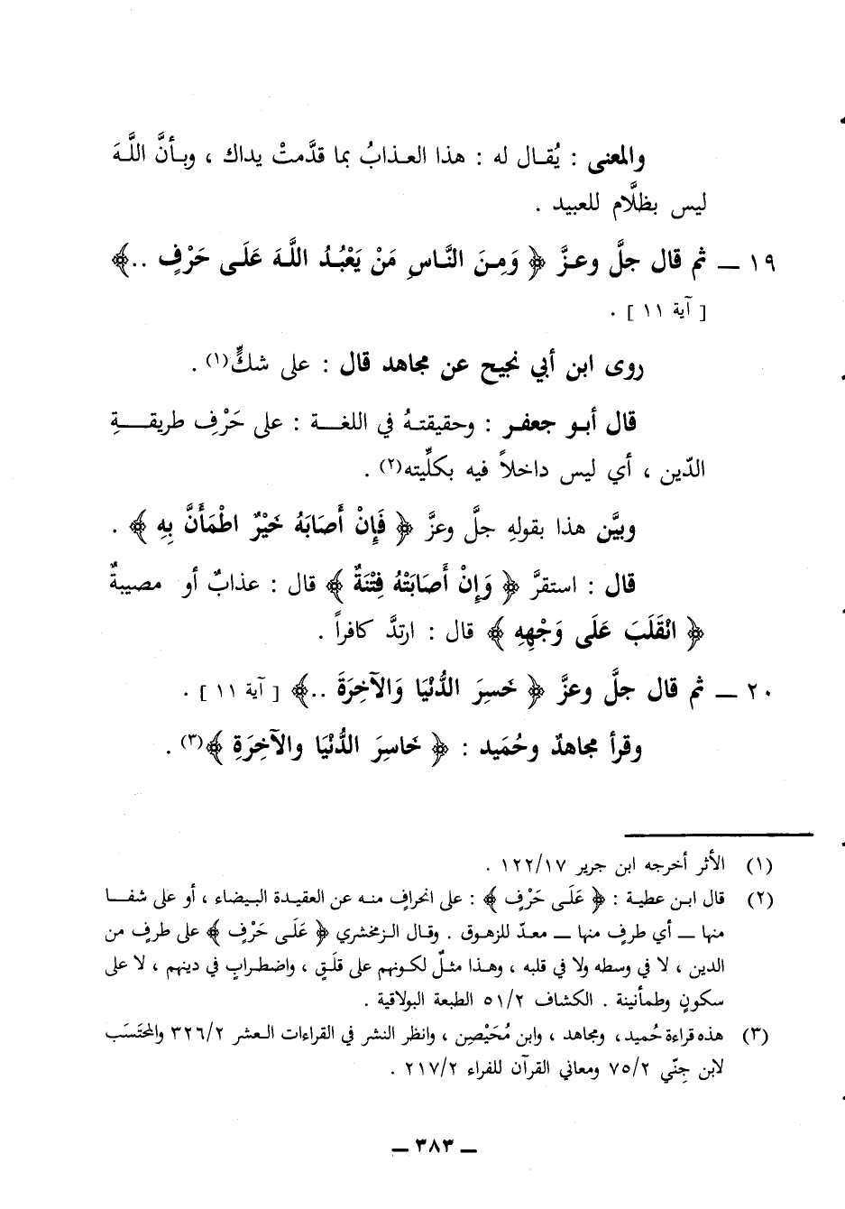 والمعنى يقال له هذا العذاب بما قدمت يداك وبأن الله ليس بظلام للعبيد 19 - ثم قال جل وعز ومن الناس من يعبد الله على حرف ايه 11 روى ابن أبي نجيح عن مجاهد قال على شك قال أبو جعفر وحقيقته في اللغة على حرف طريقة الدين أي ليس داخلا فيه بكليته وبين هذا بقوله جل وعز فإن أصابه خير اطمأن به قال استقر وإن أصابته فتنة قال عذاب أو مصيبة انقلب على وجهه قال ارتد كافرا 20 - ثم قال جل وعز خسر الدنيا والاخرة ايه 11 وقرأ مجاهد وحميد خاسر الدنيا والاخرة