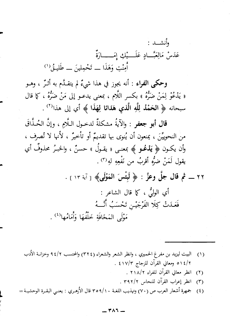 وأنشد * عدس ما لعباد عليك إمارة * أمنت وهذا تحملين طليق * وحكى الفراء أنه يجوز في هذا شئ لم يتقدم به أثر وهو يدعو لمن ضره بكسر اللام بمعنى يدعو إلى من ضره كما قال سبحانه الحمد لله الذي هدانا لهذا أي إلى هذا قال أبو جعفر والاية مشكلة لدخول اللام وإن الحذاق من النحويين يمنعون أن ينوى بها تقديم أو تأخير لأنها لا تصرف وأن يكون يدعو بمعنى يقول حسن والخبر محذوف أي يقول لمن ضره أقرب من نفعه له 22 - ثم قال جل وعز لبئس المولى ايه 13 أي الولي كما قال الشاعر * فعدت كلا الفرجين تحسب أنه * مولى المخافة خلفها وأمامها *