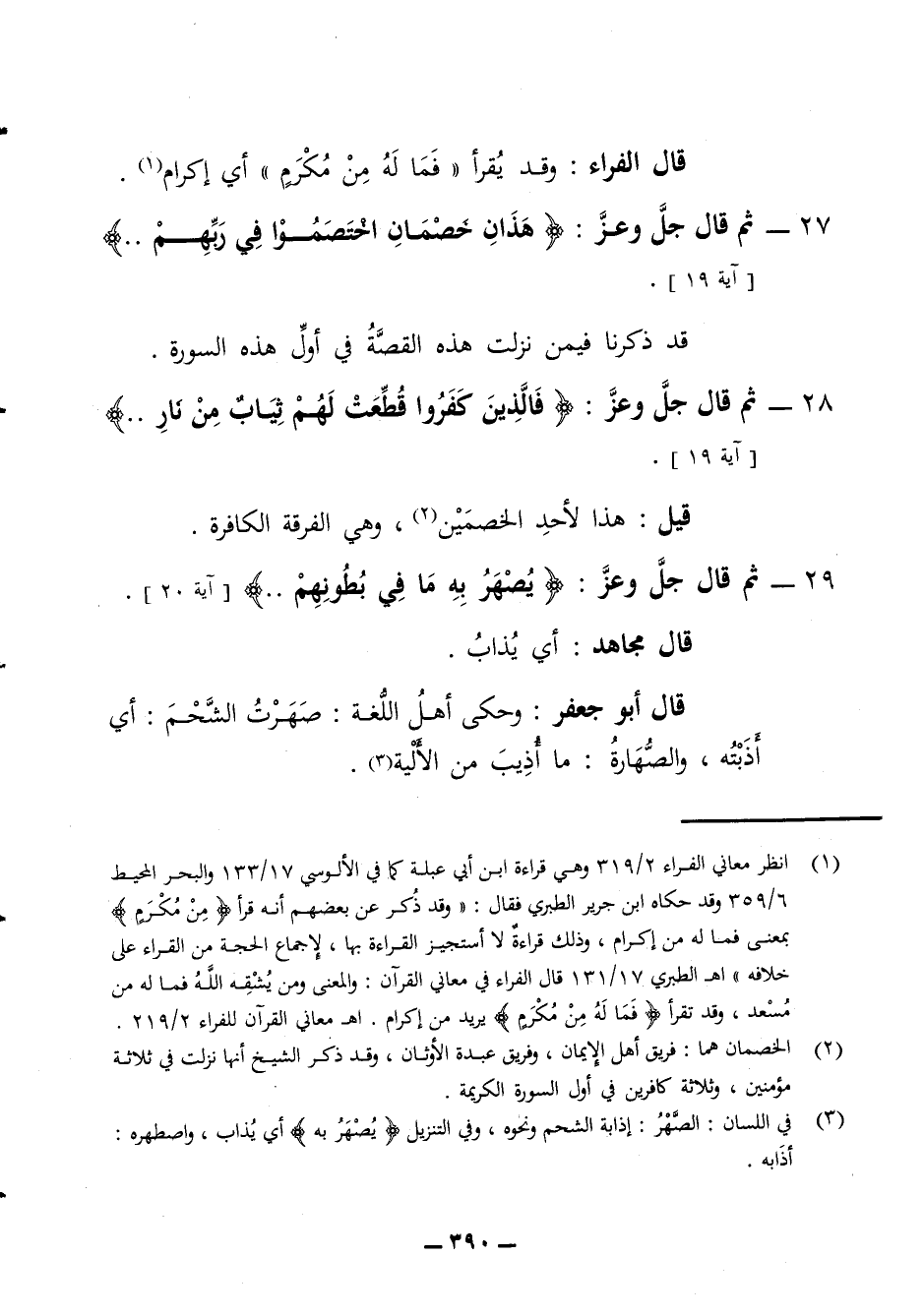 قال الفراء وقد يقرأ فما له من مكرم أي إكرام 0 27 ثم قال جل وعز هذان خصمان اختصموا في ربهم ايه 19 قد ذكرنا فيمن نزلت هذه القصة في أول هذه السورة 28 - ثم قال جل وعز فالذين كفروا قطعت لهم ثياب من نار ايه 19 قيل هذا لأحد الخصمين وهي الفرقة الكافرة 29 - ثم قال جل وعز يصهر به ما في بطونهم ايه 20 قال مجاهد أي يذاب قال أبو جعفر وحكى أهل اللغة صهرت الشحم أي أذبته والصهارة ما أذيب من الألية
