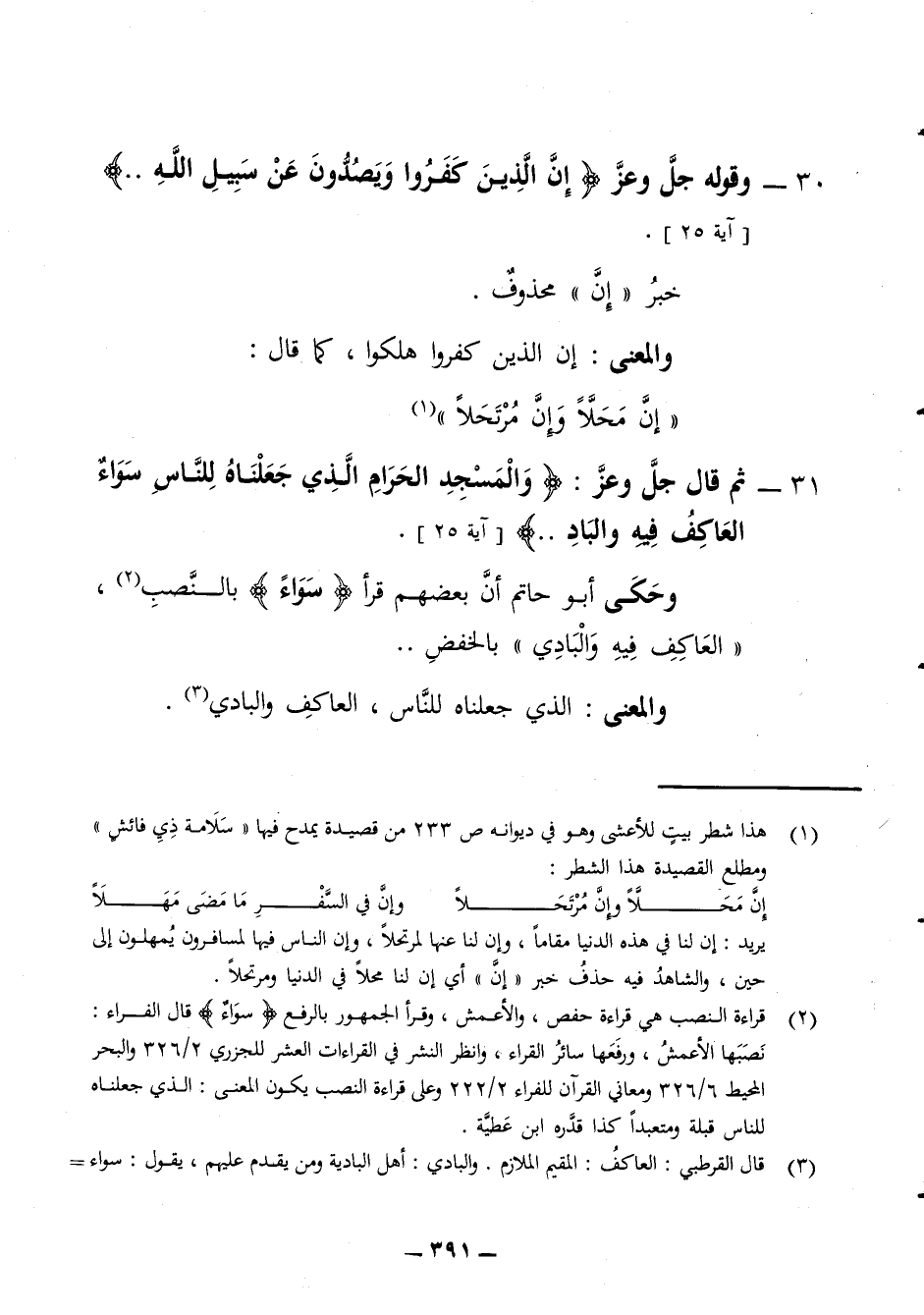 30 - وقوله جل وعز إن الذين كفروا ويصدون عن سبيل الله ايه 25 خبر إن محذوف والمعنى إن الذين كفروا هلكوا كما قال إن محلا وإن مرتحلا 31 - ثم قال جل وعز والمسجد الحرام الذي جعلناه للناس سواء العاكف فيه والباد ايه 25 وحكى أبو حاتم أن بعضهم قرأ سواء بالنصب العاكف فيه والبادئ بالخفض والمعنى الذي جعلناه للناس العاكف والبادي