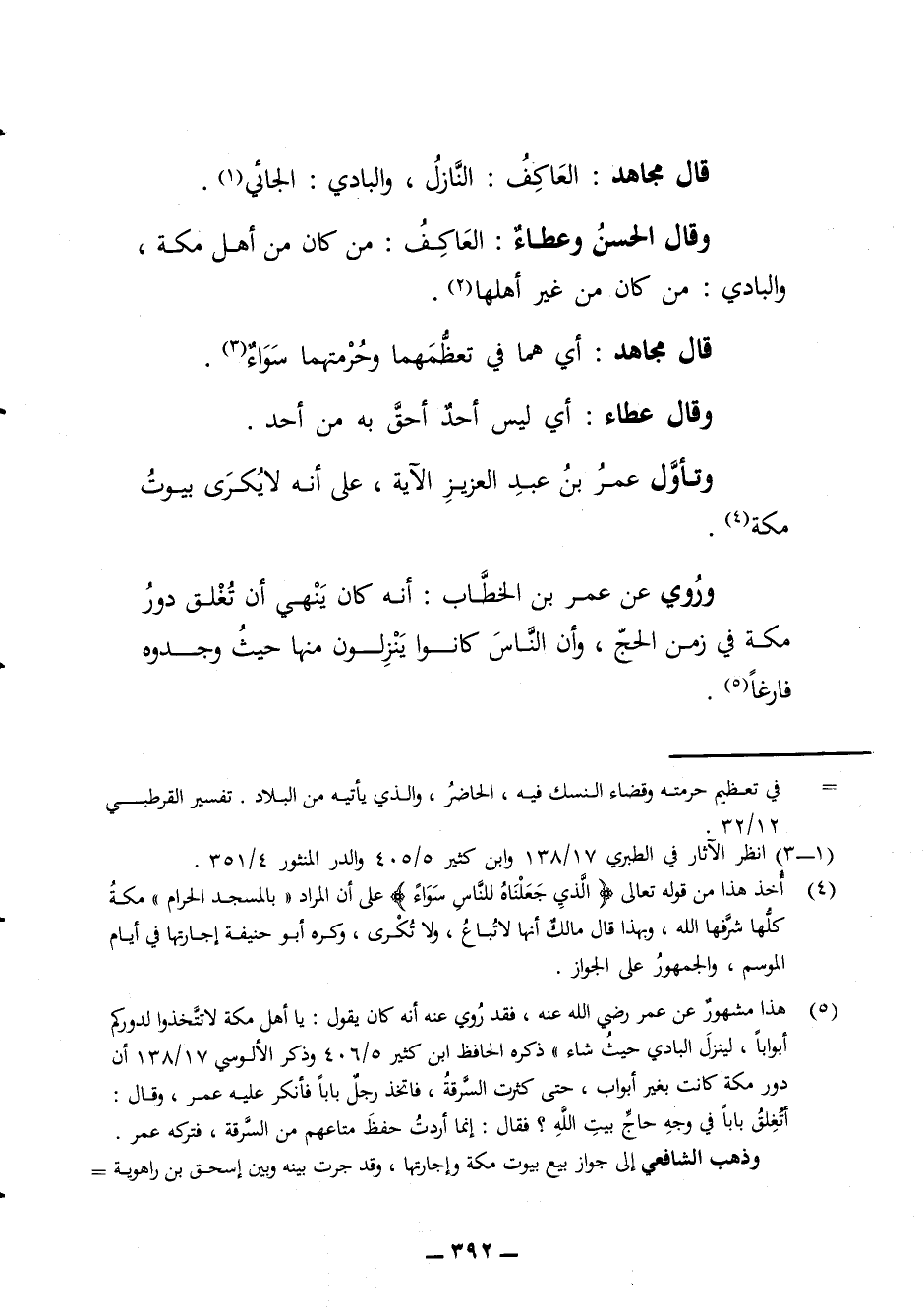 قال مجاهد العاكف النازل والبادي الجائي وقال الحسن وعطاء العاكف من كان من أهل مكة والبادي من كان من غير أهلها قال مجاهد أي هما في تعظمهما: وحرمتهما سواء وقال عطاء أي ليس أحد أحق به من أحد وتأول عمر بن عبد العزيز الاية على أنه لا يكرى بيوت مكة وروي عن عمر بن الخطاب أنه كان ينهي أن تغلق دور مكة في زمن الحج وأن الناس كانوا ينزلون منها حيث وجدوه فارغا