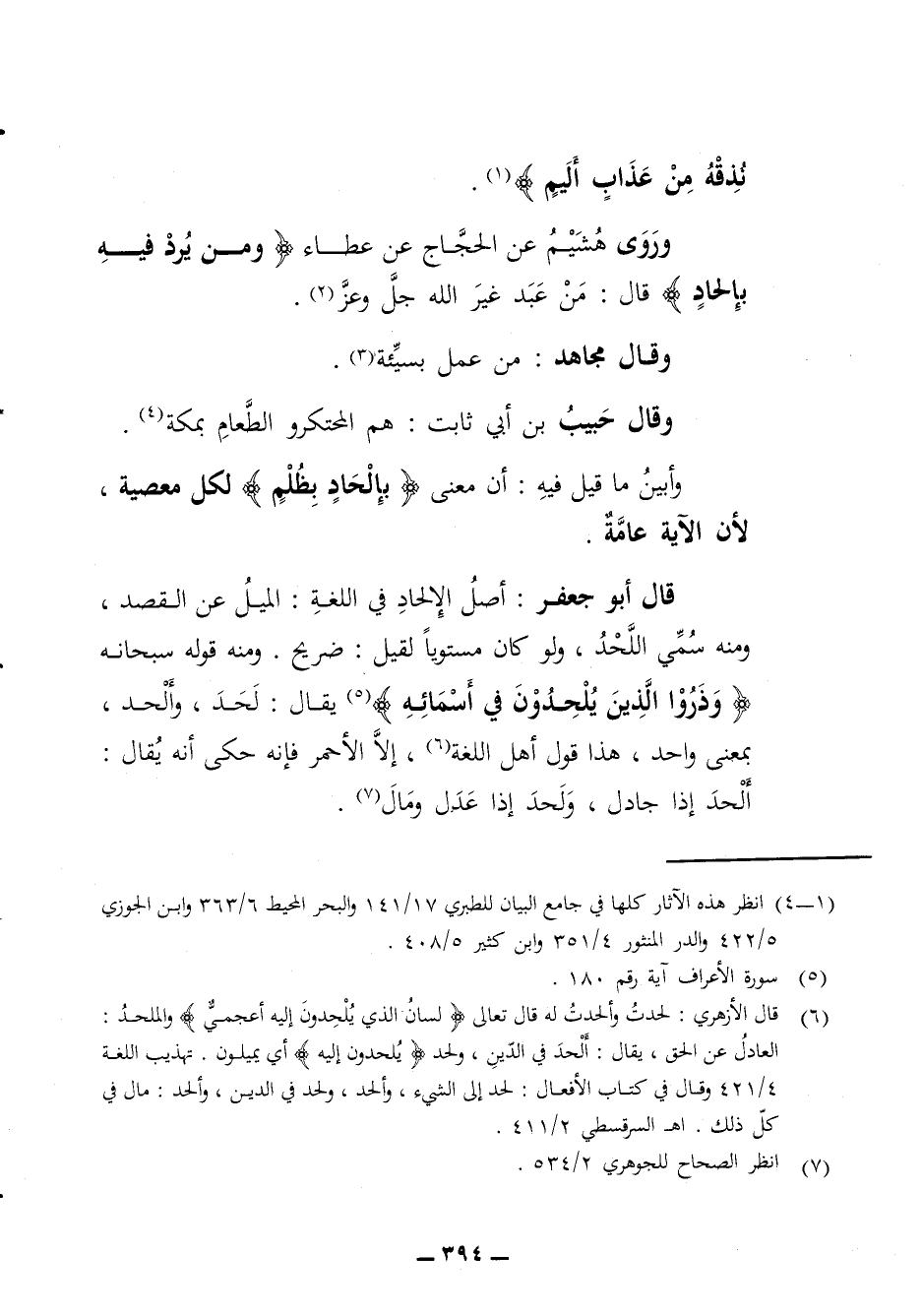 غير نذقه من عذاب أليم وروى هشيم عن الحجاج عن عطاء ومن يرد فيه بإلحاد قال من عبد غير الله جل وعز وقال مجاهد من عمل بسيئة وقال حبيب بن أبي ثابت هم المحتكرو أحمد الطعام بمكة وأبين ما قيل فيه أن معنى بإلحاد بظلم لكل معصية لأن الاية عامة قال أبو جعفر أصل الإلحاد في اللغة الميل عن القصد ومنه سمي اللحد ولو كان مستويا لقيل ضريح ومنه قوله سبحانه وذروا الذين يلحدون في أسمائه يقال لحد وألحد بمعنى واحد هذا قول أهل اللغة إلا الأحمر فإنه حكى أنه يقال