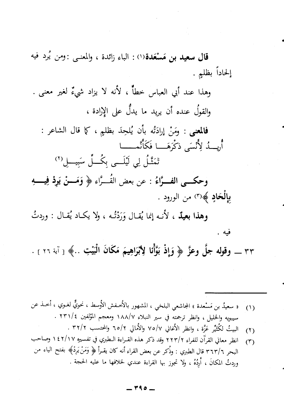 قال سعيد بن مسعدة الباء زائدة والمعنى ومن يرد فيه إلحاد بظلم وهذا عند أبي العباس خطأ لأنه لا يزاد شئ لغير معنى والقول عنده أن يريد ما يدل على الإرادة فالمعنى ومن إرادته بأن يلحد بظلم كما قال الشاعر * أريد لأنسى ذكرها فكأنما * تمثل لي ليلى بكل سبيل * وحكى الفراء عن بعض القراء ومن يرد فيه بإلحاد من الورود وهذا بعيد لأنه إنما يقال وردته ولا يكاد يقال وردت فيه 33 - وقوله جل وعز وإذ بوأنا لإبراهيم مكان البيت ايه 26