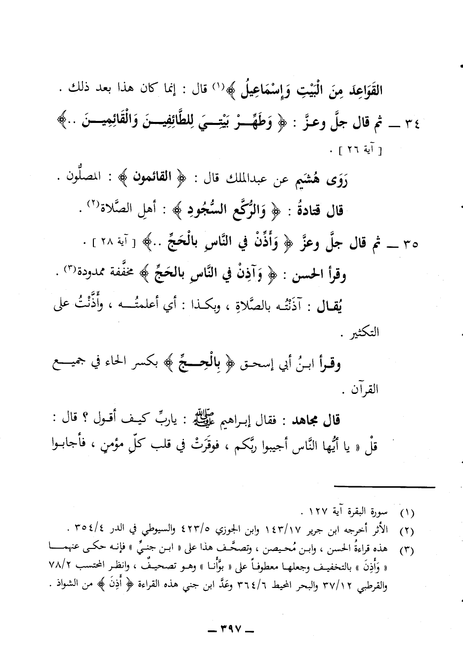 القواعد من البيت وإسماعيل قال إنما كان هذا بعد ذلك 34 - ثم قال جل وعز وطهر بيتي للطائفين والقائمين ايه 26 روى هشيم عن عبد الملك قال القائمون المصلون قال قتادة والركع السجود أهل الصلاة 35 - ثم قال عز وجل وأذن في الناس بالحج ايه 28 وقرأ الحسن واذن في الناس بالحج مخففة ممدودة يقال اذنته بعد بالصلاة وبكذا أي أعلمته وأذنت على التكثير وقرأ ابن أبي إسحق بالحج بكسر الحاء في جميع القران قال مجاهد فقال إبراهيم صلى الله عليه وسلم يا رب كيف أقول قال قل يا أيها الناس أجيبوا ربكم وفوقرت يقول في قلب كل مؤمن فأجابوا