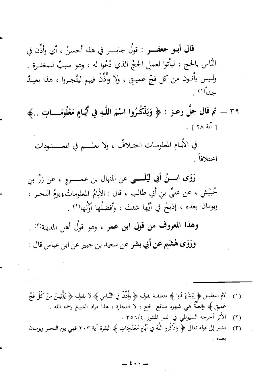 قال أبو جعفر قول جابر في هذا أحسن أي وأذن في الناس بالحج ليأتوا لعمل الحج الذي دعوا له وهو سبب للمغفرة وليس يأتون من كل فج عميق ولا وأذن فيهم ليتجروا الذي هذا بعيد جدا 39 - ثم قال جل وعز ويذكروا اسم الله في أيام معلومات في الأيام المعلومات اختلاف ولا نعلم في المعدودات اختلافا روى ابن ليلى عن المنهال بن عمرو عن زر بن حبيش عن علي بن أبي طالب قال الأيام المعلومات يوم النحر ويومان بعده إذبح في أيها شئت وأفضلها وأولها وهذا المعروف من قول ابن عمر وهو قول أهل المدينة وروى هشيم عن أبي بشر عن سعيد بن جبير عن ابن عباس قال
