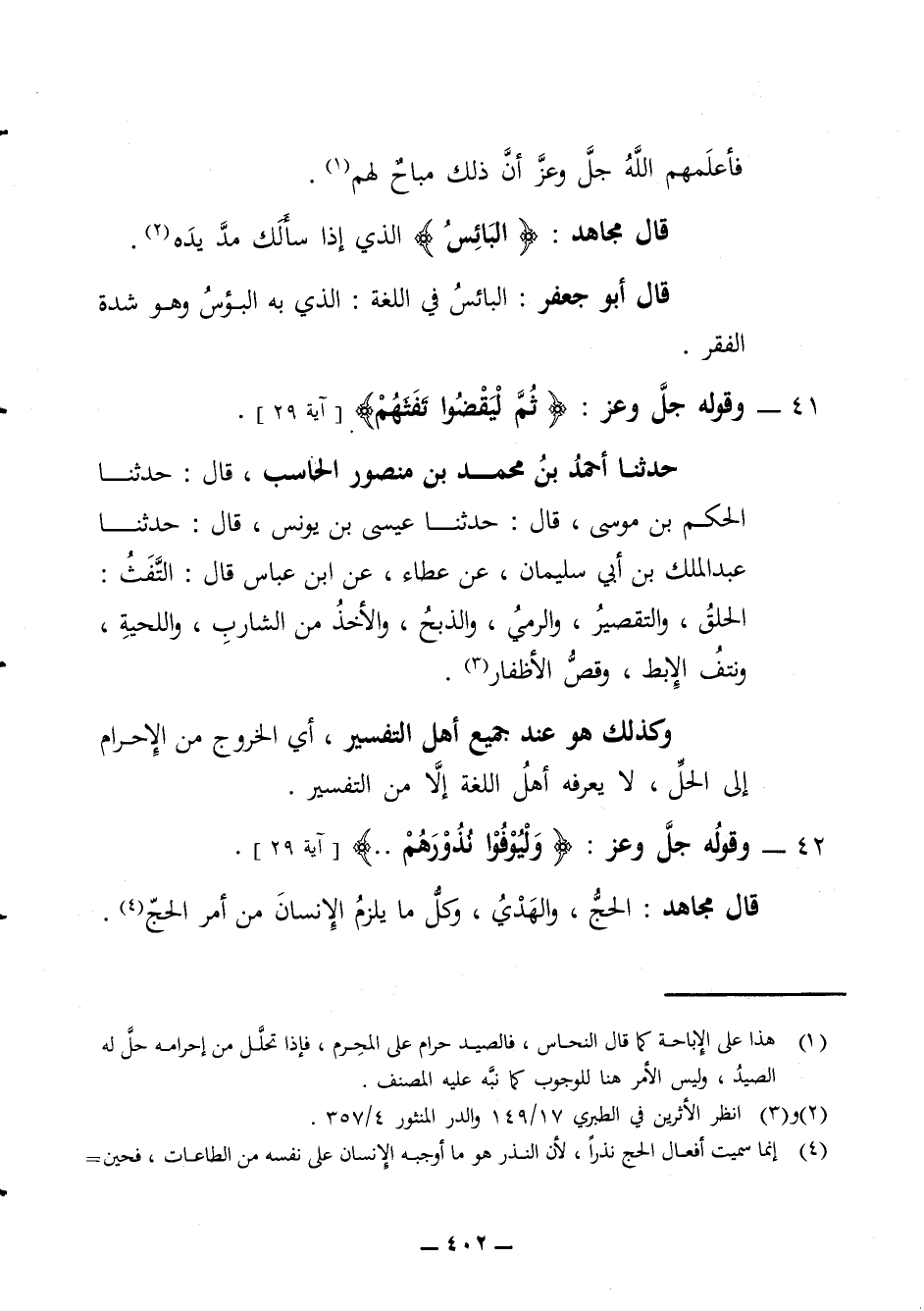 فأعلمهم الله جل وعز أن ذلك مباح لهم قال مجاهد البائس الذي إذا إذا سألك مد يده قال أبو جعفر البائس في اللغة الذي به البؤس وهو شدة الفقر 41 - وقوله جل وعز ثم ليقضوا تفثهم حدثنا أحمد بن محمد بن منصور الحاسب قال حدثنا الحكم بن موسى قال حدثنا عيسى بن يونس قال حدثنا عبد الملك بن سليمان عن عطاء عن ابن عباس قال التفث الحلق والتقصير والرمي والذبح والأخذ من الشارب واللحية ونتف الإبط وقص الإظفار وكذلك هو عند جميع اهل التفسير أي الخروج من الإحرام إلى الحل لا يعرفه أهل اللغة إلا من التفسير 42 - وقوله جل وعز وليوفوا نذورهم قال مجاهد الحج والهدي وكل ما يلزم الإنسان من أمر الحج