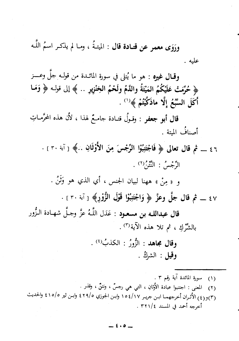 وروى معمر عن قتادة قال الميتة وما لم يذكر اسم الله عليه وقال غيره هو ما يتلى في سورة المائدة من قوله جل وعز حرمت عليكم الميتة الدم ولحم الخنزير إلى قوله وما أكل السبع إلا ما ذكيتم قال أبو جعفر وقول قتادة جامع لهذا لأن هذه المحرمات أصناف الميتة 46 - ثم قال تعالى فاجتنبوا الرجس من الأوثان الرجس النتن ومن ههنا لبيان الجنس أي الذي هو وثن 47 - ثم قال جل وعز واجتنبوا قول الزور قال عبد الله بن مسعود عدل الله عز وجل شهادة الزور بالشرك ثم تلا هذه الآية وقال مجاهد الزور الكذب وقيل الشرك