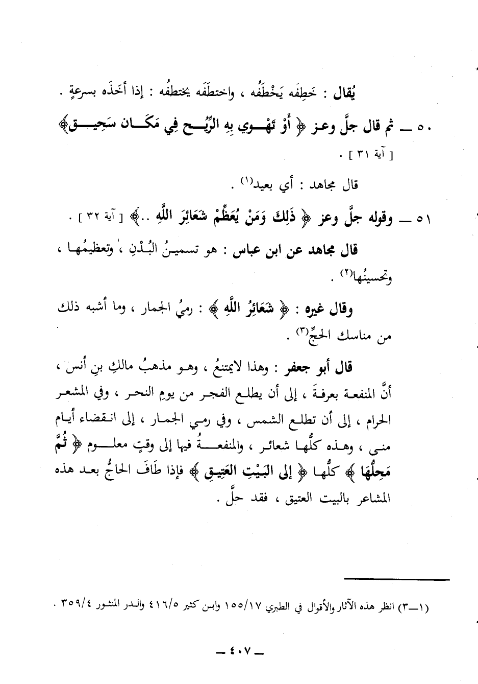 يقال خطفه يخطفه واختطفه لأن يختطفه إذا أخذه بسرعة 50 - ثم قال جل وعز أو تهوي به الريح في مكان سحيق قال مجاهد أي بعيد 51 - وقوله جل وعز ذلك من يعظم شعائر الله قال مجاهد عن ابن عباس هو تسمين البدن وتعظيمها وتحسينها وقال غيره شعائر الله رمي الجمار وما أشبه ذلك من مناسك الحج قال أبو جعفر وهذا لا يمتنع وهو مذهب مالك بن أنس أن المنفعة بعرفة إلى أن يطلع الفجر من يوم النحر وفي المشعر الحرام إلى أن تطلع الشمس وفي رمي الجمار إلى انقضاء أيام منى وهذه كلها شعائر والمنفعة فيها الى وقت معلوم ثم محلها كلها إلى البيت العتيق فإذا طاف الحاج بعد هذه المشاعر بالبيت العتيق فقد حل