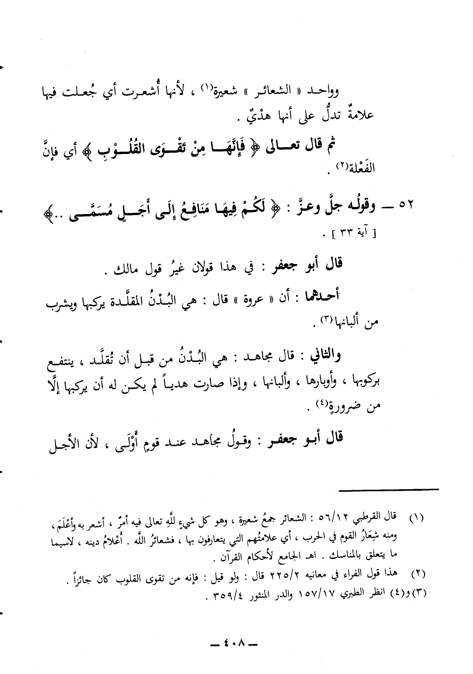 ثم قال تعالى فإنها من تقوى القلوب أي فإن الفعلة 52 - وقوله جل وعز لكم فيها منافع إلى أجل مسمى قال أبو جعفر في هذا قولان غير قول مالك أحدهما أن عروة قال في البدن المقلدة يركبها ويشرب من ألبانها والثاني قال مجاهد هي البدن من قبل أن تقلد ينتفع بركوبها وأوبارها وألبانها وإذا صارت هديا لم يكن له أن يركبها إلا من ضرورة قال أبو جعفر وقول مجاهد عند قوم أولى لأن الأجل