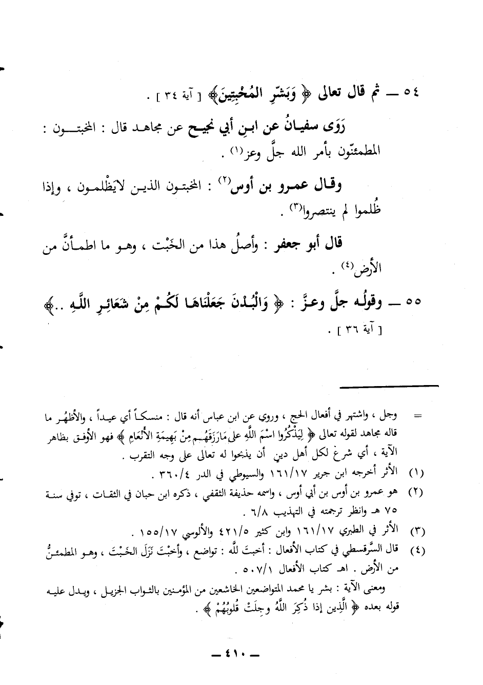 54 - ثم قال تعالى وبشر المحبتين روى سفيان عن ابن ابي نجيح عن مجاهد قال المخبتون المطمئنون بأمر الله جل وعز وقال عمرو بن أوس المخبتون الذين لا يظلمون وإذا ظلموا وقد لم ينتصروا قال أبو جعفر وأصل هذا من الخبت وهو ما اطمأن من الأرض 55 - وقوله جل وعز والبدن جعلناها لكم من شعائر الله