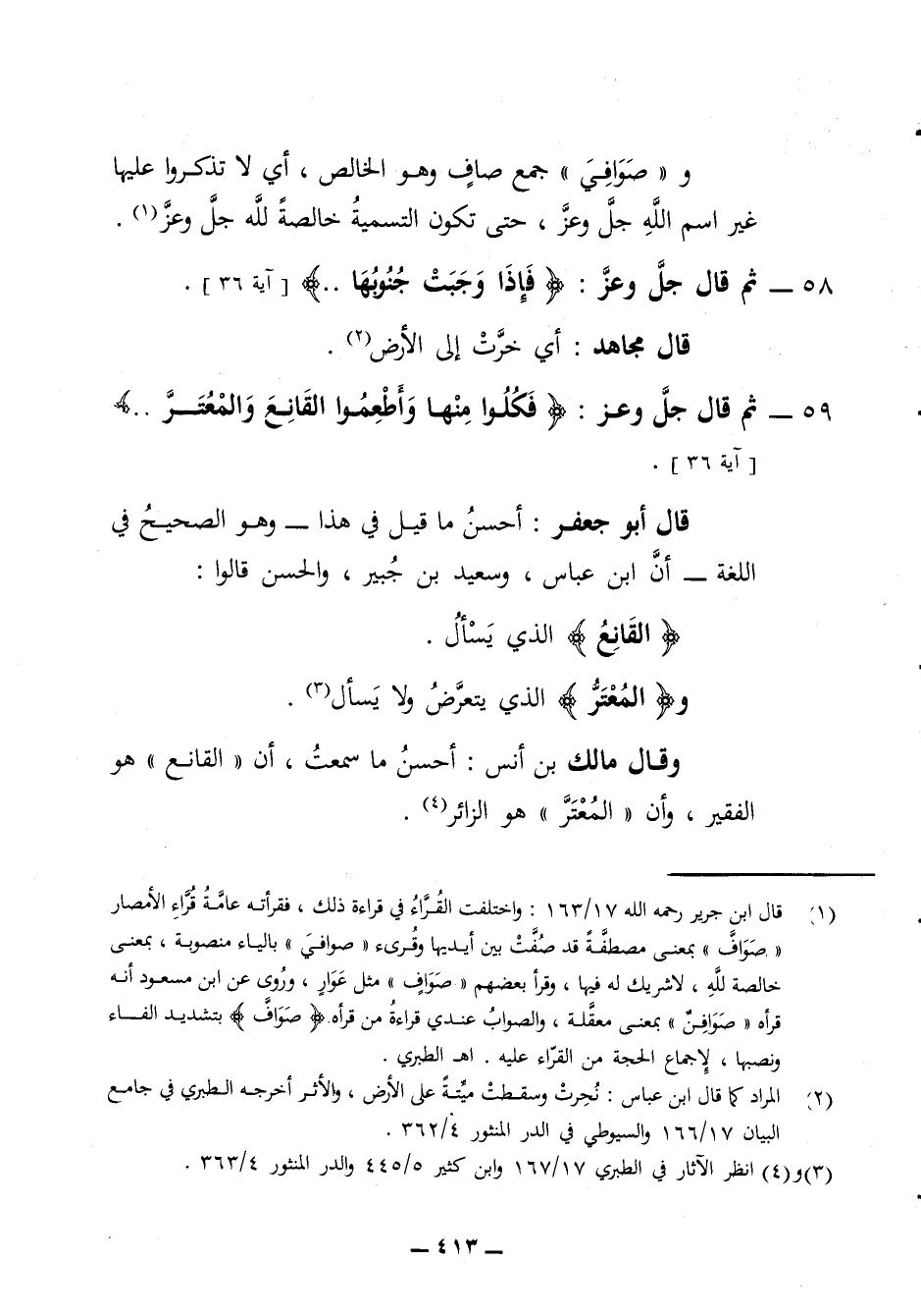 وصوافي جمع صاف وهو الخالص أي لا تذكروا عليها غير اسم الله جل وعز حتى تكون التسمية خالصة الله جل وعز 58 - ثم قال جل وعز فإذا وجبت جنوبها قال مجاهد أي خرت الى الأرض 59 - ثم قال جل وعز فكلوا منها وأطعموا القانع والمعتر قال أبو جعفر أحسن ما قيل في هذا وهو الصحيح في اللغة أن ابن عباس وسعيد بن جبير والحسن قالوا