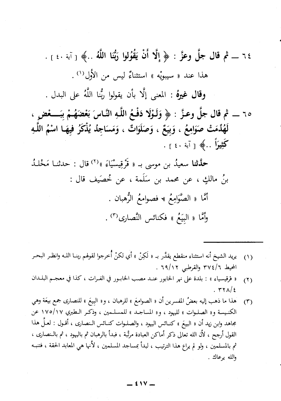 64 - ثم قال جل وعز إلا أن يقولوا ربنا الله هذا عند سيبويه استثناء ليس من الأول وقال غيره المعنى إلا بأن يقولوا ربنا الله على البدل 65 - ثم قال جل وعز ولولا دفع الله الناس بعضهم ببعض لهدمت صوامع وبيع وصلوات ومساجد يذكر فيها اسم الله كثيرا