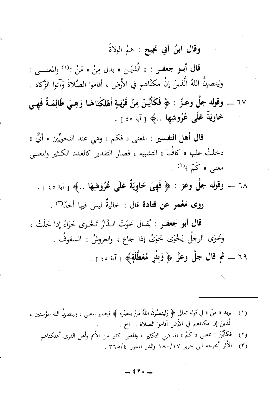 وقال ابن أبي نجيح هم الولاة قال أبو جعفر الذين بدل من من والمعنى ولينصرن الله الذين إن مكناهم في الأرض أقاموا الصلاة وأتوا الزكاة 67 - وقوله جل وعز فكأين قرية أهلكناها وهي ظالمة فهي خاوية على عروشها آية 45 قال أهل التفسير المعنى فكم وهي عند النحويين أي دخلت عليها كاف التشبيه فصار التقدير كالعدد الكثير والمعنى معنى كم 68 - وقوله جل وعز فهي خاوية على عروشها آية 45 وروي معمر عن قتادة قال خالية ليس فيها أحد قال أبو جعفر يقال خوت الدار تخوي خواء إذا خلت وخوى الرجل يخوي خوى إذا جاع والعروش السقوف 69 - ثم قال جل وعز وبئر معطلة