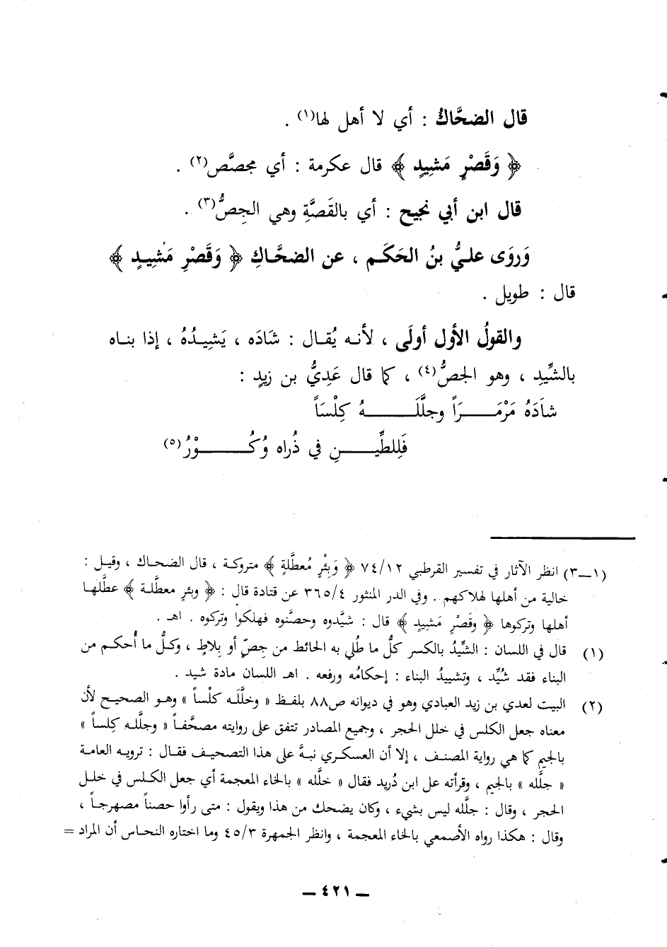 قال الضحاك أي لا أهل لها وقصر مشيد قال عكرمة أي مجصص قال ابن أبي نجيح أي بالقصة وهي الجص وروي علي بن الحكم عن الضحاك وقصر مشيد قال طويل