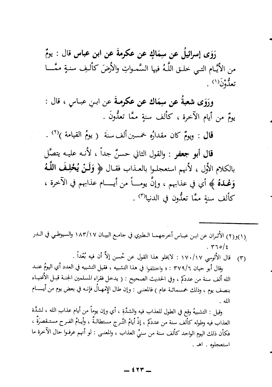 روي إسرائيل عن سماك عن عكرمة عن ابن عباس قال يوم من الأيام التي خلق الله فيها السموات والأرض كألف سنة مما تعدون وروى شعبة عن سماك عن عكرمة عن ابن عباس قال يوم من أيام الآخرة كألف سنة مما تعدون قال ويوم كان مقداره خمسين ألف سنة يوم القيامة
