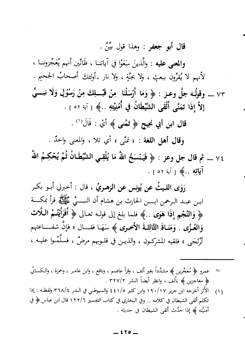 إلا إذا تمنى ألقى الشيطان في أمنيته آية 52 قال بن أبي نجيح تمنى أي قال وقال أهل اللغة تمنى أي تلا والمعنى واحد 74 - ثم قال جل وعز فينسخ الله ما يلقى الشيطان ثم يحكم الله آياته آية 52 روى الليث عن يونس عن الزهري قال أخبرني أبو بكر ابن عبد الرحمن ابن الحارث بن هشام أن النبي صلى الله عليه وسلم قرأ بمكة والنجم إذا هوى فلما بلغ إلى ى قوله تعالى أمرأيتم هو اللات والعزى ومناة الثالثة الأخرى سها فقال فإن شفاعتهم ترتجى فلقيه المشركون والذين في قلوبهم مرض فسلموا عليه