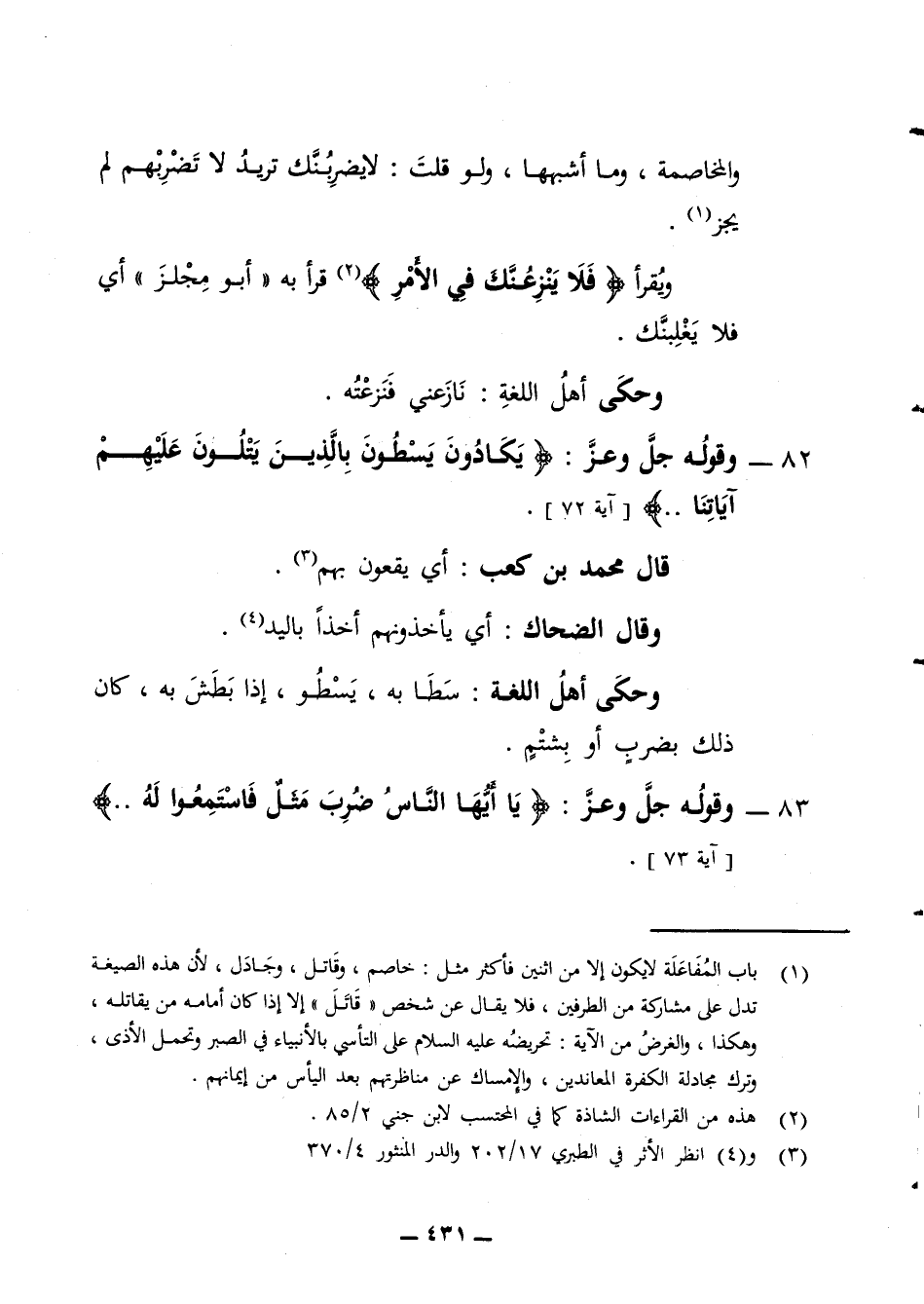 والمخاصمة وما أشبهها ولو قلت لا يضربنك تريد لا تضربهم لم يجز ويقرأ فلا ينزعنك في الأمر قرأ به أبو مجلز أي فلا يغلبنك وحكى أهل اللغة نازعني فنزعته 82 - وقوله جل وعز يكادون يسطون بالذين يتلون عليهم آياتنا آية 72 قال محمد بن كعب أي يقعون بهم وقال الضحاك أي يأخذونهم أخذا باليد وحكى أهل اللغة سطا به يسطو إذا بطش به كان ذلك بضرب أو بشتم 83 - وقوله جل وعز يا أيها الناس ضرب مثل فاستمعوا له آية 73